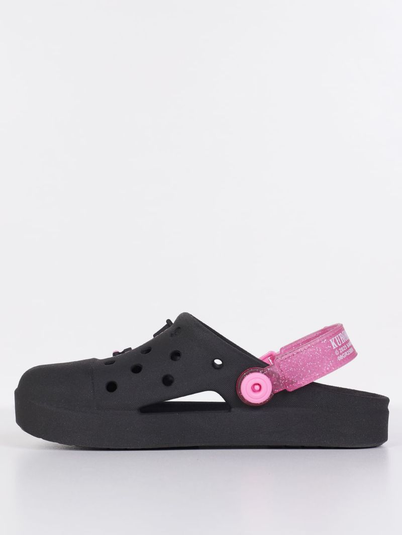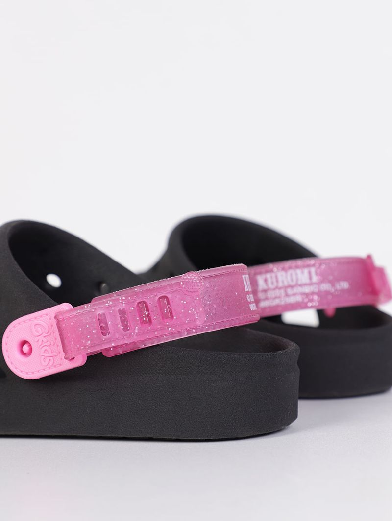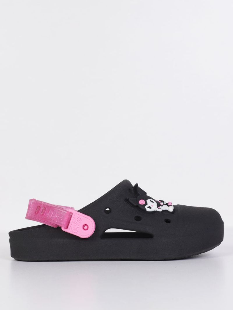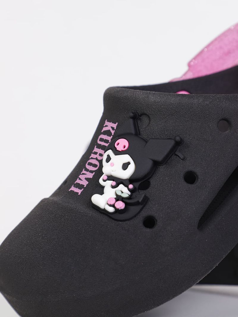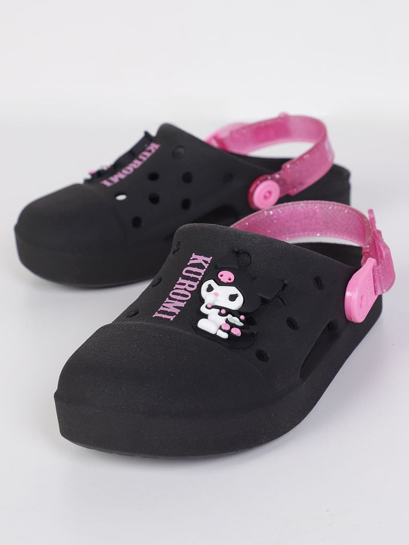 Babuche infantil para menina desenvolvida em PVC, um material flexível e de boa qualidade. O modelo apresenta como destaque a aplicação emborrachada da personagem de anime Kuromi no cabedal. Conta com formato arredondado e tira ajustável que pode ser usada tanto na parte frontal ou no calcanhar. Além disso, possui palmilha confortável texturizada e furos pelo cabedal que permitem respirabilidade. Ideal para brincar, passear ou até mesmo para usar em casa, ela oferece segurança com seu solado antiderrapante. Com essa Babuche personalizada, o conforto do dia a dia ganha um toque divertido e cheio de atitude que as pequenas vão amar!\n\nMaterial: PVC