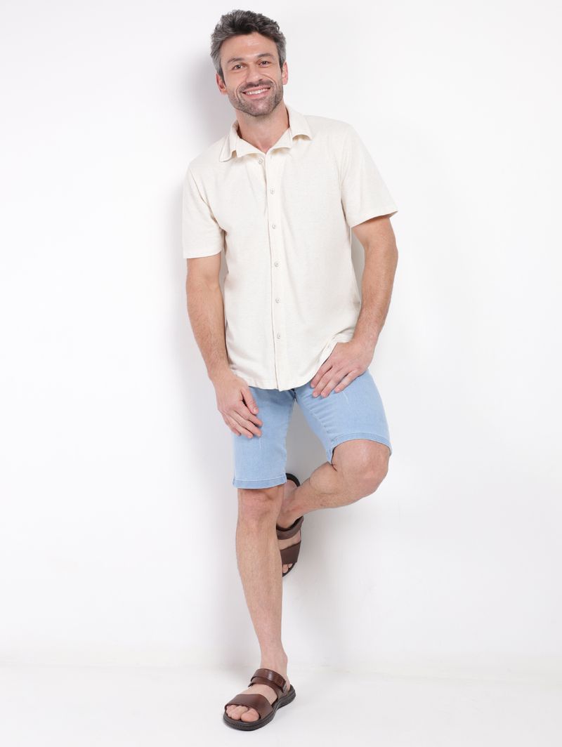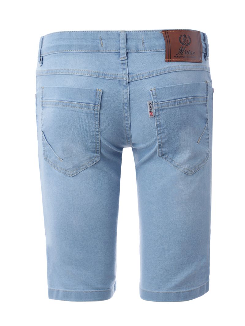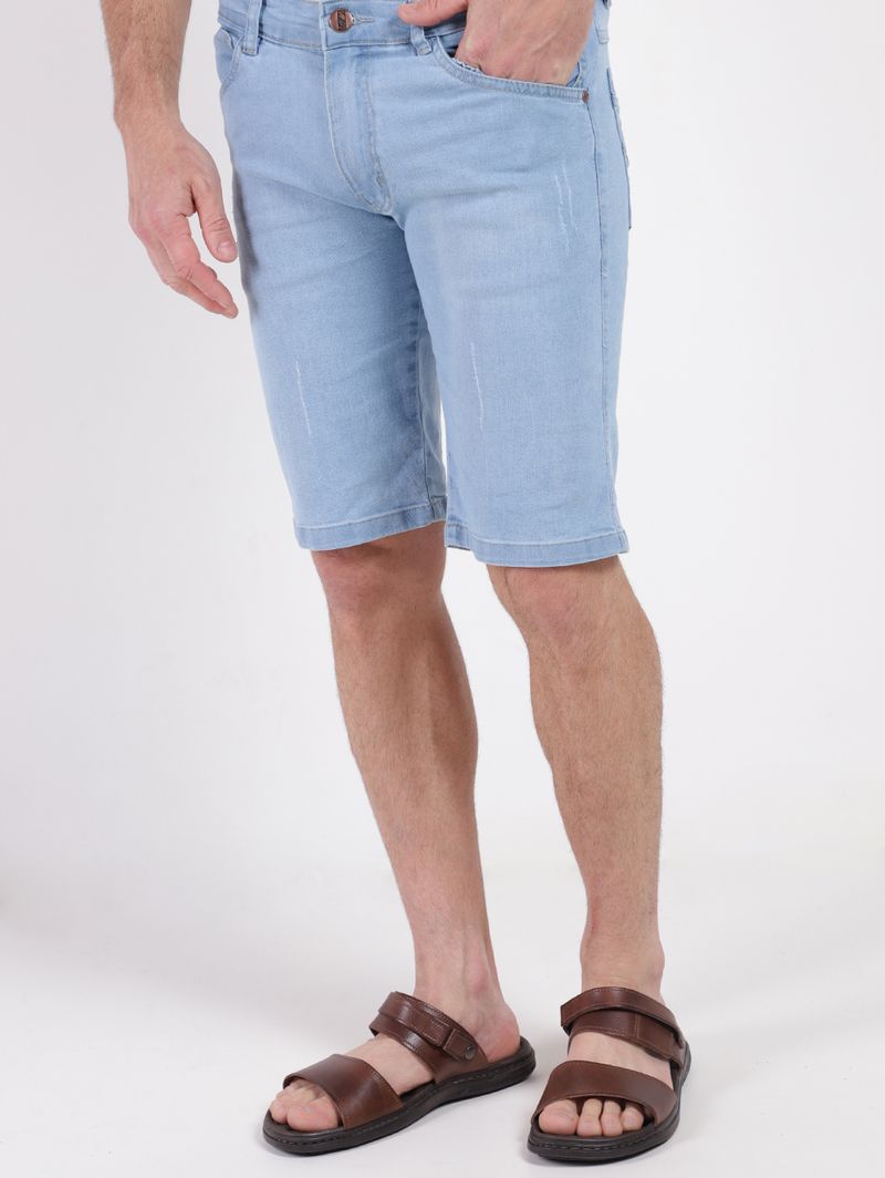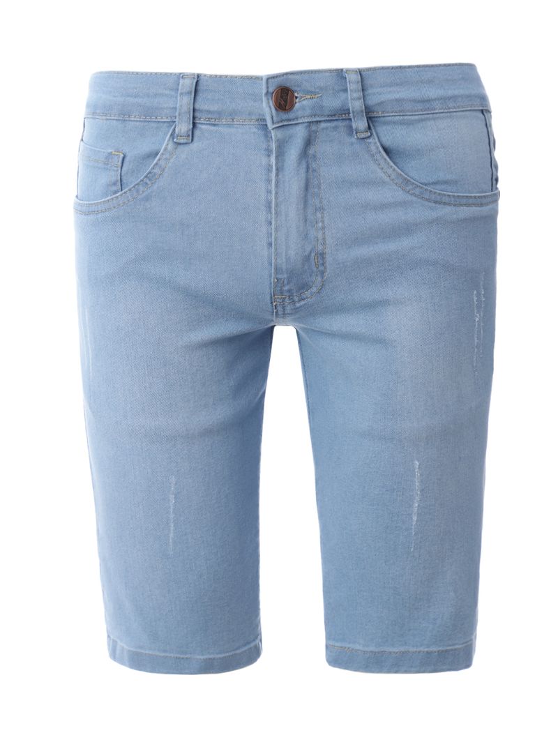 Bermuda masculina desenvolvida em jeans com lavagem clara, que oferece um visual clássico e versátil. Possui caimento tradicional com corte reto, cós com passantes para cinto, fechamento frontal por botão de casa e zíper e acabamentos simples com costuras contrastantes. Conta com bolsos frontais e posteriores funcionais. Apresenta diferencial de puídos pela sua extensão, um detalhe estratégico que adiciona um toque de estilo despojado e moderno ao visual. Seja para um passeio casual ou um encontro com amigos, essa é a peça-chave que vai elevar o seu guarda-roupa!\n\nTecido: Jeans\nLavagem: Clara com Puídos\nComposição: 82% algodão, 16% poliéster, 02% elastano