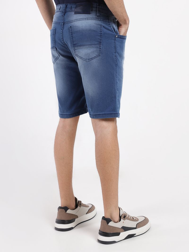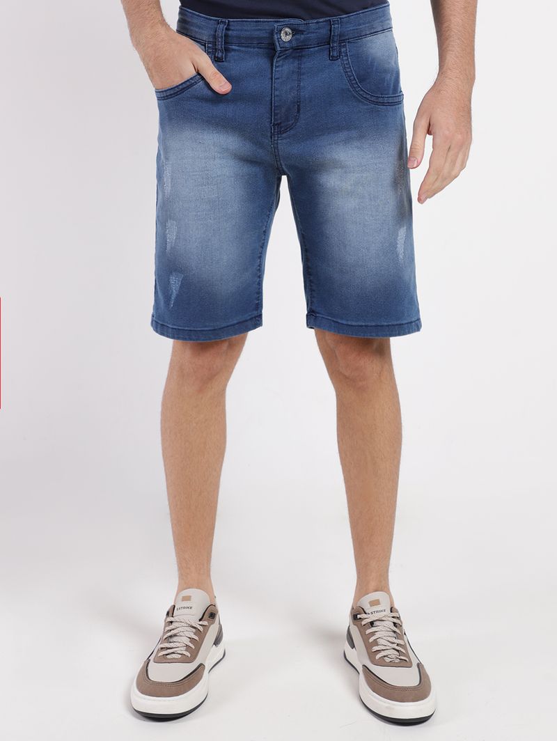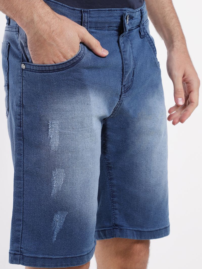 Bermuda masculina desenvolvida em jeans com elastano em sua composição que garante ainda mais conforto e mobilidade. O modelo apresenta fechamento frontal por botão de casa e zíper, cós com passantes para cinto e acabamentos simples. Possui lavagem estonada com diferencial de puídos pela sua extensão, modernizando ainda mais a peça. Seus bolsos frontais e posteriores são funcionais. Invista nessa peça e tenha sempre uma escolha moderna e descomplicada no guarda-roupa!\n\nTecido: Jeans\nLavagem: Estonada\nComposição: 71% algodão, 27% poliéster, 02% elastano