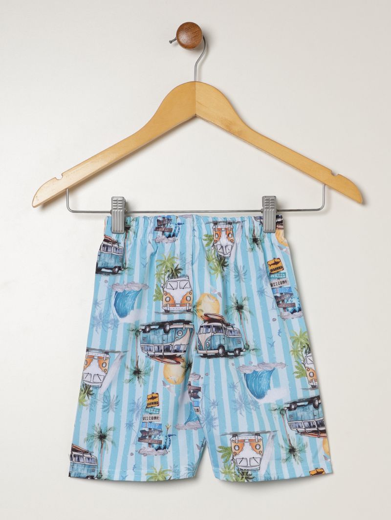 Bermuda infantil para menino confeccionada em microfibra leve e confortável, proporcionando liberdade de movimento para as brincadeiras do dia a dia. Conta com cós elástico e cordão decorativo, além de acabamentos simples que garantem um visual moderno e prático. O destaque fica por conta da estampa moderna aplicada por toda a extensão, trazendo estilo e personalidade ao look dos pequenos!\n\nTecido: Microfibra\nComposição: 92% poliéster, 08% elastano