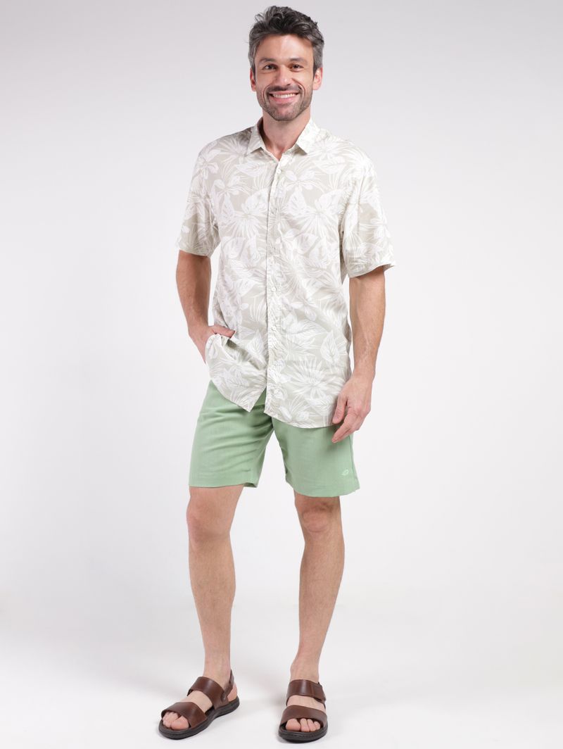 Bermuda masculina desenvolvida em sarja, um tecido conhecido por sua resistência e durabilidade, além de conter linho em sua composição, uma fibra nobre com alta capacidade de respirabilidade, ou seja, permite que o ar circule facilmente. O modelo apresenta cós com passantes para cinto, fechamento por botão de casa e zíper, bolsos frontais faca e posteriores embutidos e barra com acabamento simples. A peça perfeita para looks casuais nos dias mais quentes da estação com muito estilo e conforto!\n\nTecido: SarjaComposição: 54% poliéster, 28% viscose, 09% algodão, 09% linho