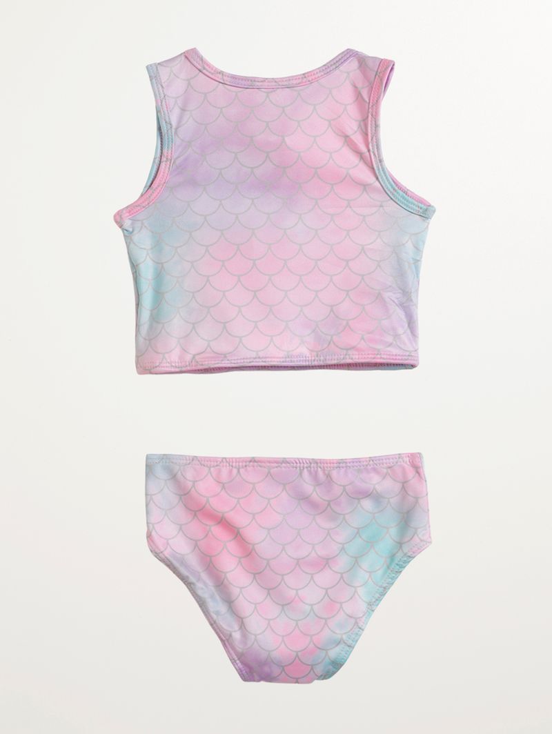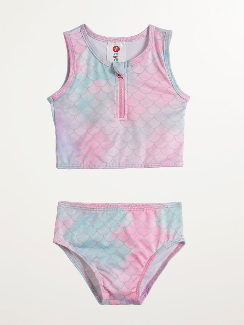 Biquíni infantil para menina perfeito para unir conforto, segurança e um visual encantador nos dias de lazer. Desenvolvido em microfibra, oferece toque macio, boa elasticidade e ajuste confortável ao corpo. O top no modelo cropped conta com forro, gola redonda, mangas cavadas, fechamento frontal por zíper e barra com acabamento simples, garantindo praticidade e firmeza ao vestir. A calcinha possui forro, laterais largas e parte posterior ampla, proporcionando conforto e segurança durante o uso. O diferencial fica por conta da estampa que remete às escamas de sereias, trazendo um visual divertido e cheio de fantasia. Ideal para acompanhar o dia a dia com estilo e liberdade de movimentos!\n\nTecido: microfibra\nComposição: 90% poliéster, 10% elastano
