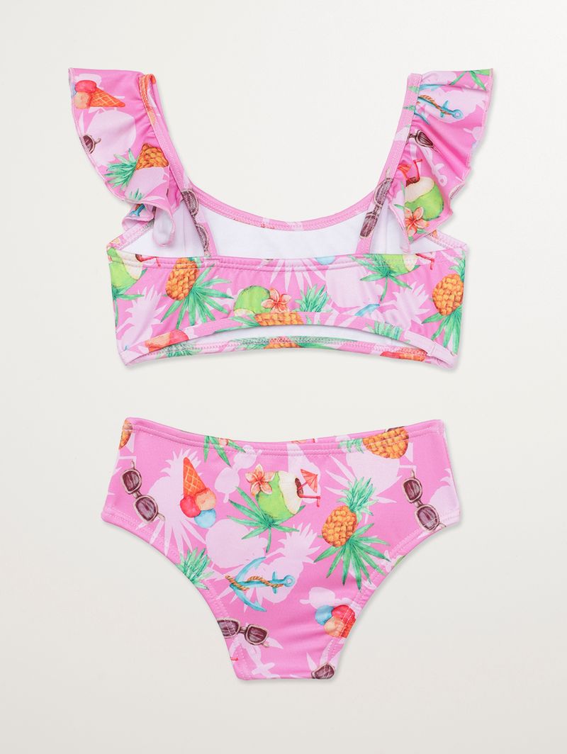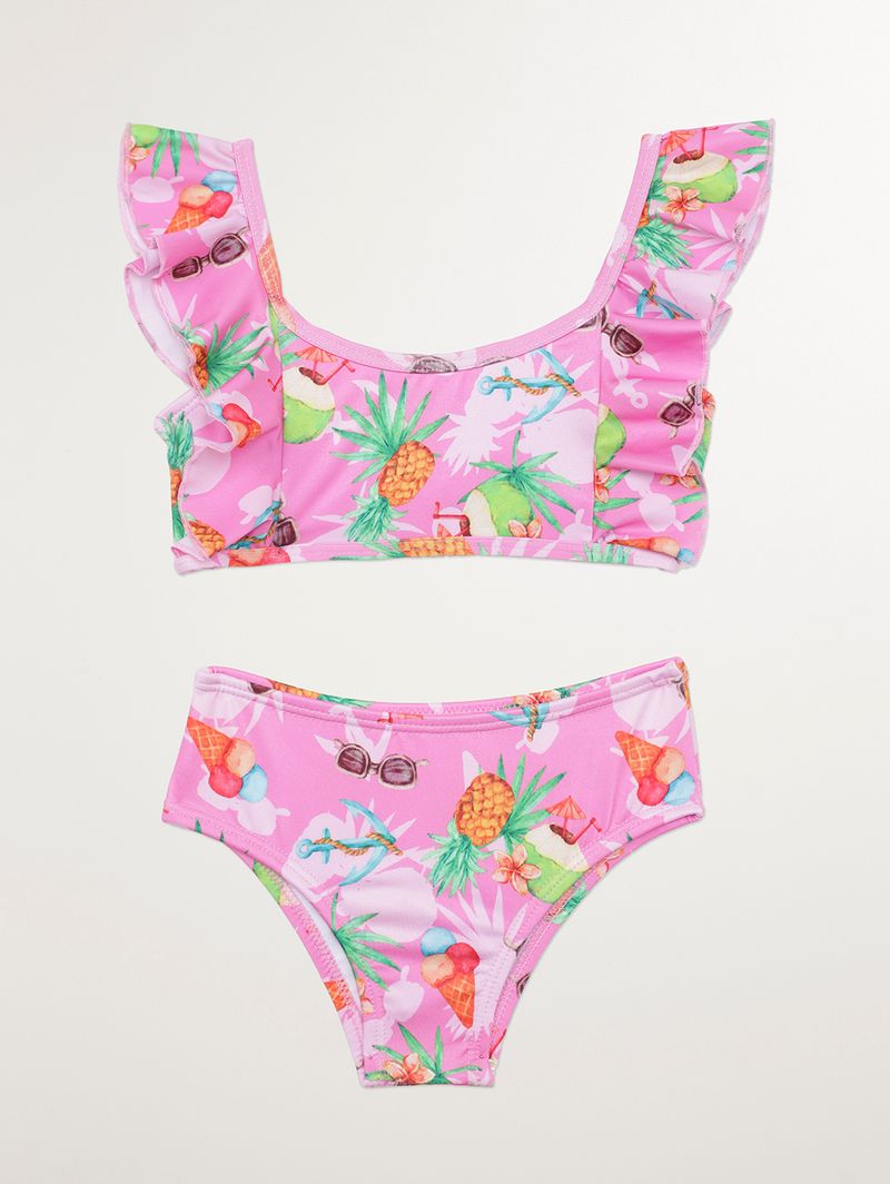 Biquíni infantil para menina desenvolvido em microfibra, um tecido com toque macio e secagem rápida, composto por top e calcinha. O top possui alças com aplicação de babados, laterais médias, acabamento elástico e forro leve. A calcinha conta com parte posterior ampla, laterais largas e parte interna forrada para garantir conforto extra. Ambas peças têm diferencial de estampa super delicada pela sua extensão, conferindo um charme extra ao visual. A escolha perfeita para sua menina curtir os dias de praia e piscina da melhor forma!\n\nTecido: Microfibra\nComposição: 92% poliéster, 08% elastano\nComposição Forro: 100% poliamida