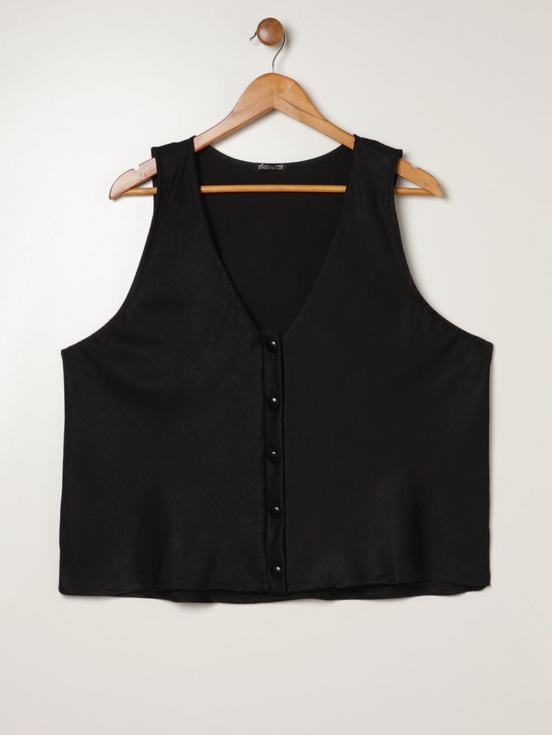 Blusa feminina desenvolvida em tecido plano acetinado, um tecido mais encorpado, de toque extremamente macio, que traz um brilho sutil à peça e entrega sofisticação e elegância a qualquer look. O modelo apresenta decote V, mangas cavadas, fechamento frontal por botões de casa e acabamentos simples. Ideal para combinar com peças clássicas ou criar produções modernas e cheias de atitude!\n\nTecido: Plano Acetinado\nComposição: 53% poliéster, 47% viscose