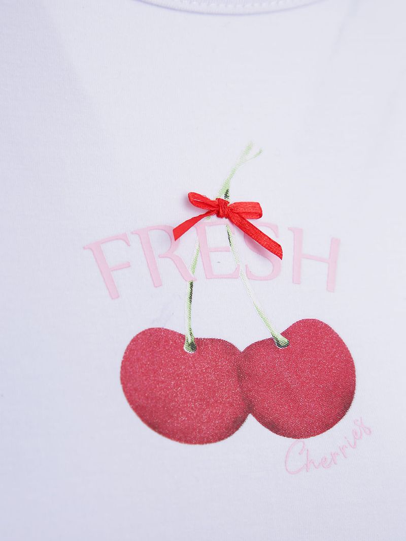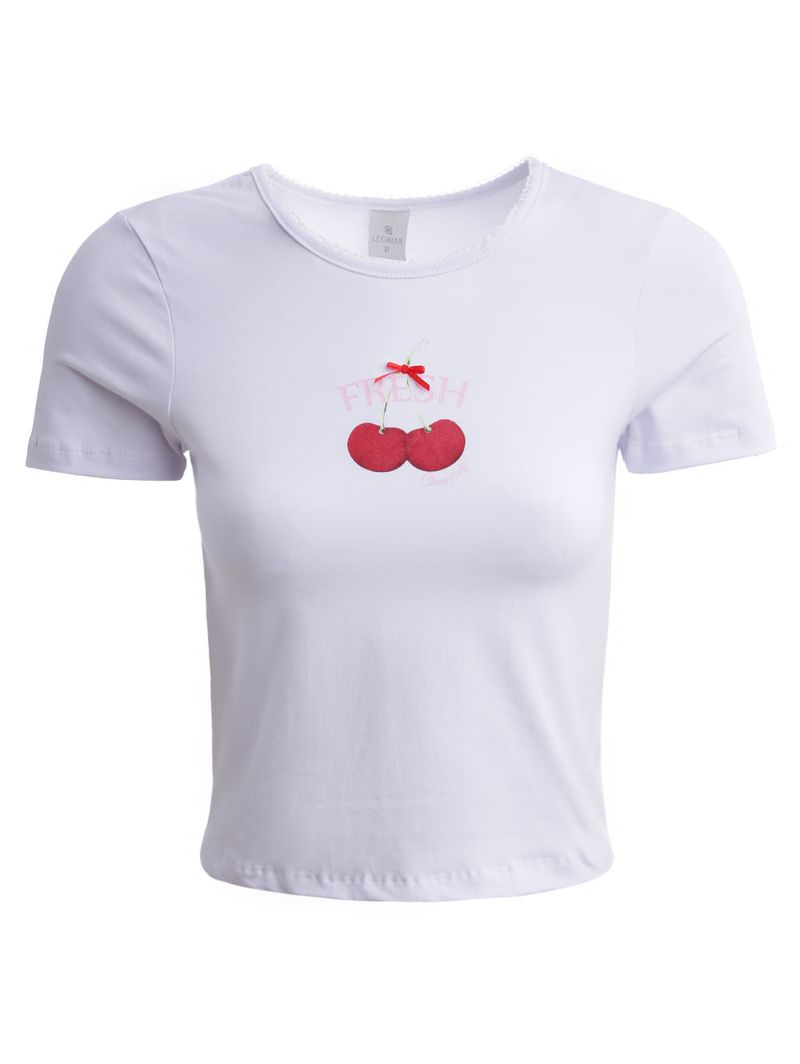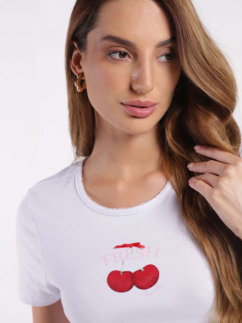 Blusa Baby Tee Cereja Manga Curta Feminina BRANCO