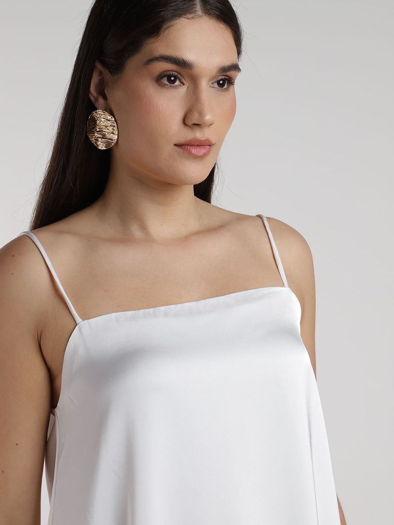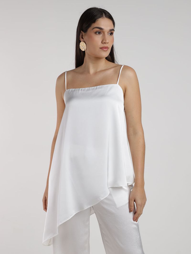 Blusa feminina desenvolvida em cetim, conhecido pelo seu brilho suave com aspecto liso que reflete a luz de forma delicada, além de forro que evita transparências. Possui modelagem assimétrica que confere um visual moderno e despojado. Apresenta alças finas, decote quadrado e barra com acabamento simples. Com caimento impecável e elegância na medida certa, perfeita para destacar sua elegância com delicadeza!\n\n Tecido: Cetim\n Composição: 100% poliéster