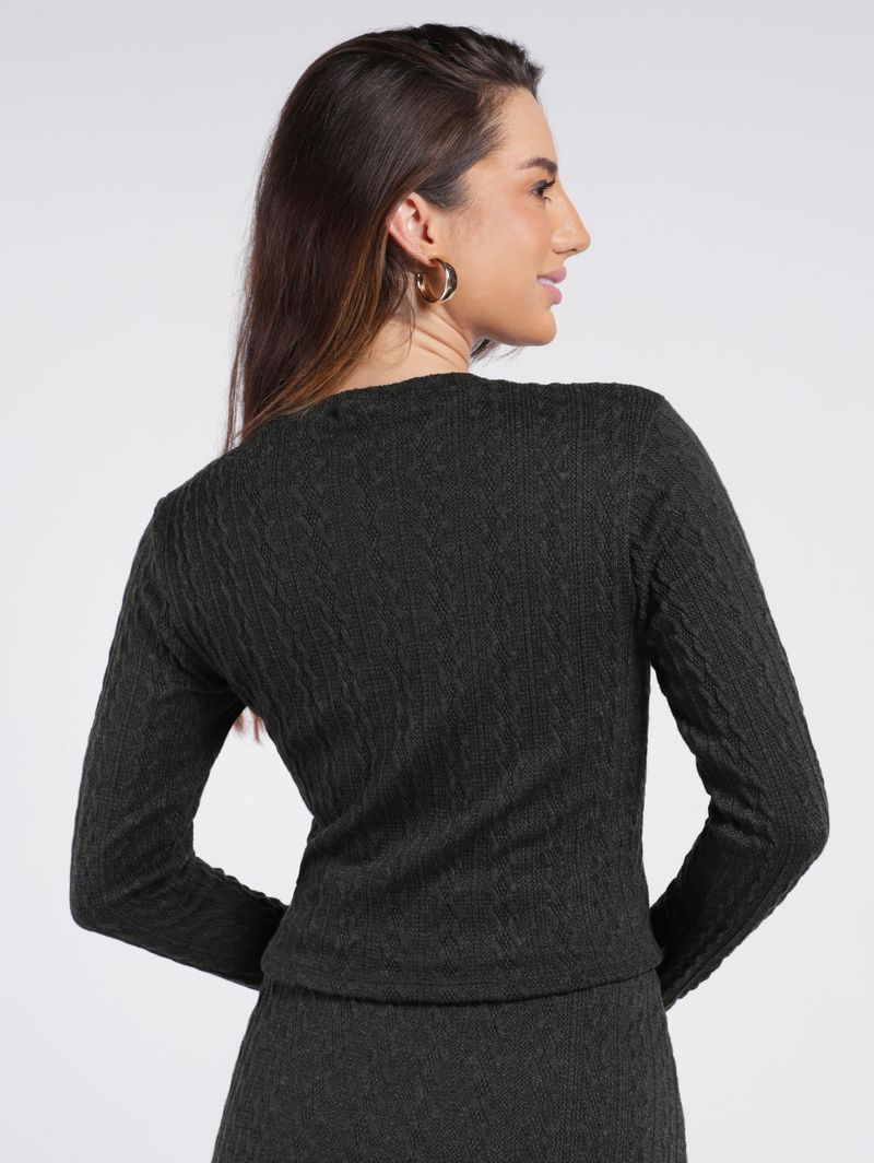 Blusa feminina desenvolvida em malha tricot que se caracteriza por possuir a aparência do tricot artesanal com a elasticidade da malha, ainda conta com caimento confortável e toque macio. Possui comprimento cropped que moderniza as produções, gola redonda, mangas longas e acabamentos pespontados. Apresenta textura formada pelas tramas do tricot que agregam sofisticação ao modelo, combinando estilo e praticidade em apenas uma peça. Aposte e destaque-se com elegância e estilo! Combine com Saias e Botas .