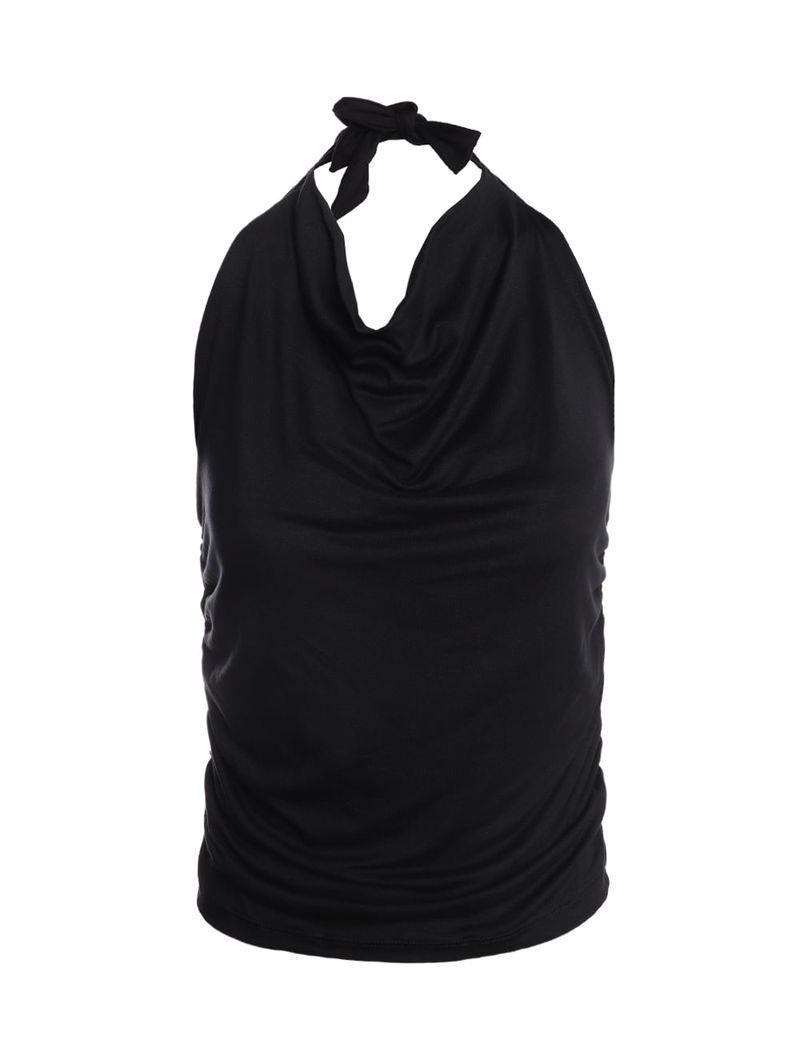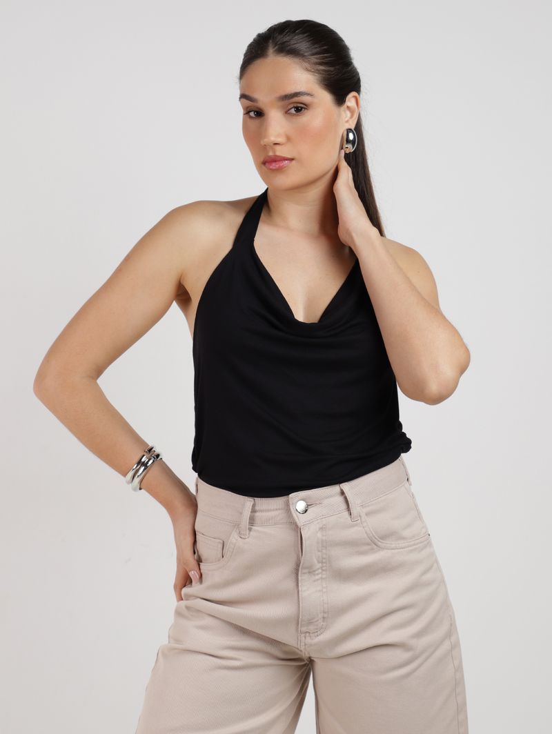 Blusa feminina desenvolvida em malha de viscose e elastano que confere toque sutil e confortável. Possui modelagem frente única, característica por ser presa apenas na parte da frente do corpo. Apresenta amarração atrás do pescoço, elástico na parte posterior, franzido nas laterais e barra com acabamento simples. A peça perfeita para ser usada em dias quentes e em produções mais despojadas ou até sofisticadas!\n\nTecido: Malha\nComposição: 96% viscose, 04% elastano