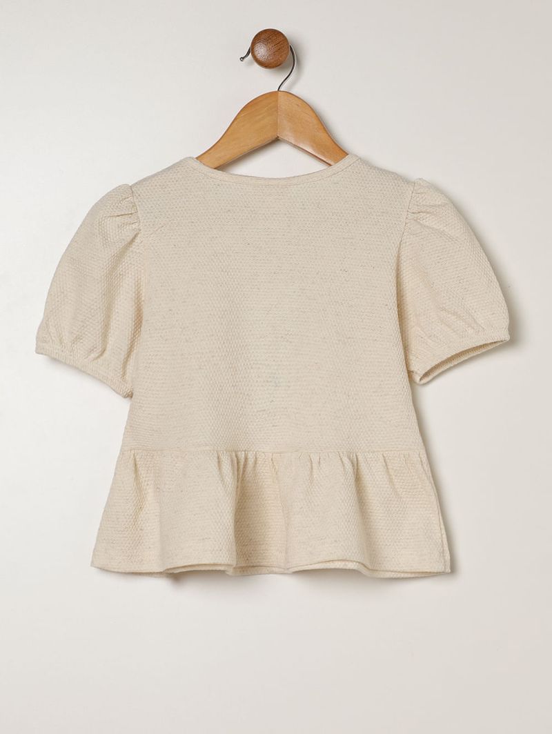 Blusa infantil para menina desenvolvida em malha texturizada 100% algodão, oferecendo toque macio, leveza e muito conforto para o dia a dia. Possui gola redonda, mangas curtas bufantes e barra com acabamento em babados, criando um visual delicado e cheio de movimento. O diferencial fica por conta das aplicações de lacinhos na parte frontal, que adicionam charme e um toque especial à peça. Ideal para compor looks modernos, confortáveis e super encantadores!\n\nTecido: Malha Texturizada\nComposição: 100% algodão