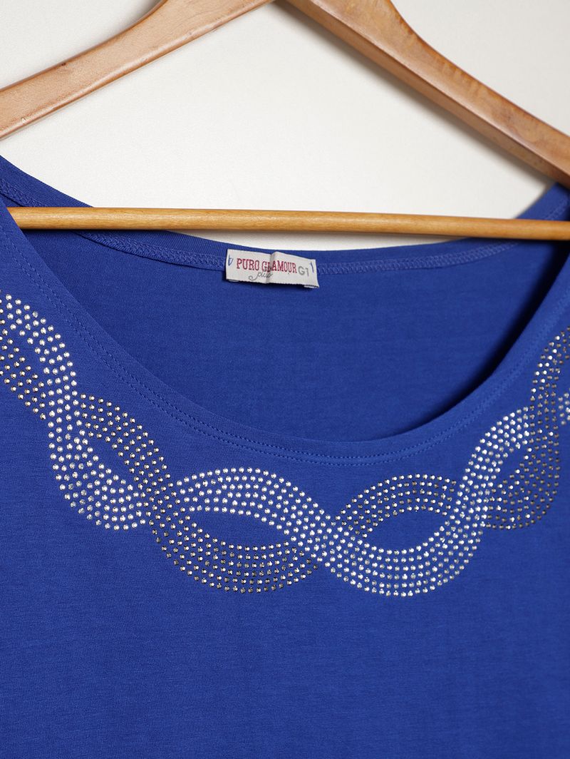 Blusa feminina desenvolvida em malha de viscose e elastano, um tecido com toque macio e caimento confortável. O modelo apresenta caimento amplo, gola redonda, mangas curtas e acabamentos simples. Possui como diferencial aplicação em hotfix na parte frontal, trazendo um toque de glamour e brilho ao seu visual. Perfeita para dar aquele toque delicado com personalidade nas suas produções!\n\nTecido: Malha\nComposição: 97% viscose, 03% elastano
