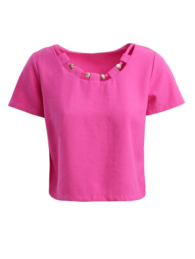 Blusa feminina desenvolvida em tecido plano , um tecido encorpado e confortável. O modelo apresenta gola redonda, mangas curtas e barra com acabamento simples. O seu diferencial fica por conta do detalhe na gola de cordão com aplicação de aviamentos que garantem um charme à peça. A blusa ideal para você arrasar em ocasiões formais, mas com um toque de estilo!