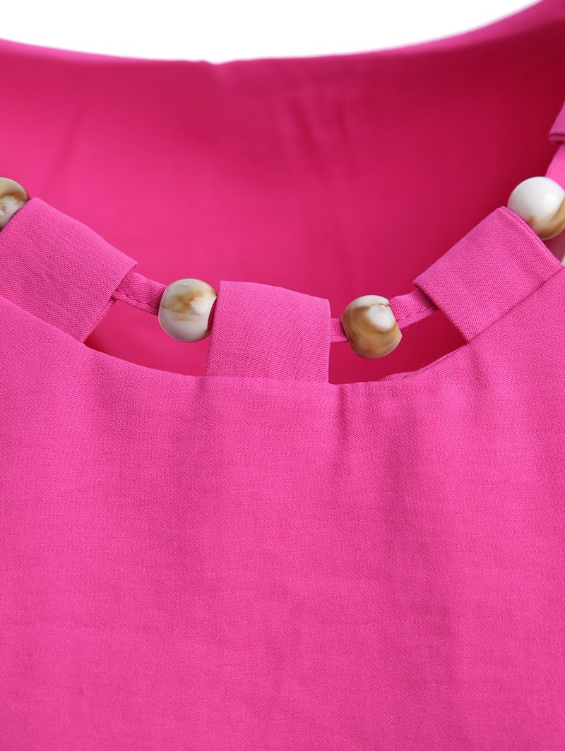 Blusa feminina desenvolvida em tecido plano, um tecido encorpado e confortável. O modelo apresenta gola redonda, mangas curtas e barra com acabamento simples. O seu diferencial fica por conta do detalhe na gola de cordão com aplicação de aviamentos que garantem um charme à peça. A blusa ideal para você arrasar em ocasiões formais, mas com um toque de estilo!\n\nTecido: Plano\nComposição: 92% viscose, 08% poliéster