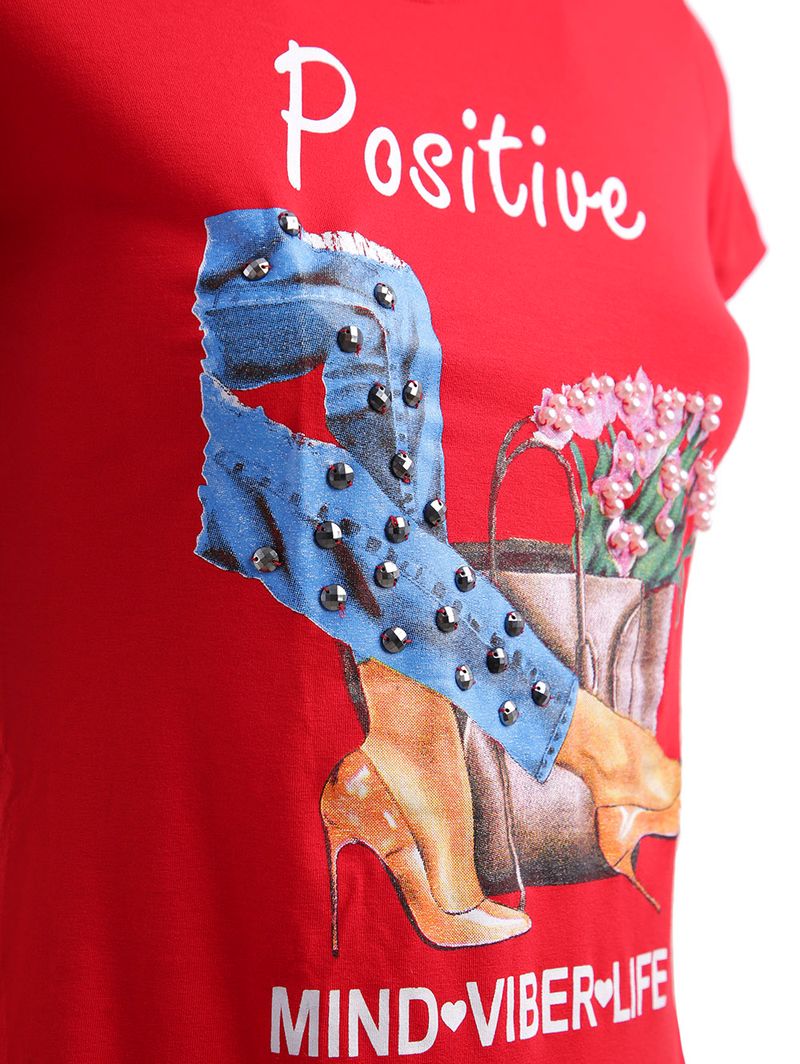 Blusa feminina desenvolvida em malha leve. A peça conta com mangas curtas, decote redondo e acabamento simples na barra. Blusa feminina desenvolvida em malha leve de viscose e elastano, ideal para promover muito conforto durante o uso. Possui diferencial de estampa frontal divertida com escritas e aplicação de pedrarias que dão toque delicado ao modelo. Apresenta mangas curtas, gola redonda e caimento confortável ao corpo, a barra tem acabamento simples. Essencial para as produções nos dias quentes da estação! Combine com Shorts de Tecido e Rasteiras.Tecido: Malha Mangas: Curtas Gola: Redonda Composição: 95% viscose, 05% elastano Marca: Linha Fixa Medidas da modelo: 1,78 de altura, 65kg e usa tamanho P.
