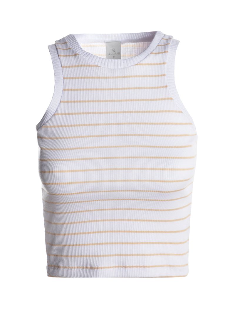 Blusa regata feminina confeccionada em malha canelada, que oferece conforto, elasticidade e ótimo caimento ao corpo. Possui gola redonda, mangas cavadas e acabamentos simples, garantindo praticidade no uso diário. O destaque fica por conta da padronagem listrada, que traz um toque moderno e atemporal à peça. Versátil e leve, é perfeita para compor produções casuais com charme e descontração!\n\nTecido: Malha Canelada\nComposição: 83% algodão, 13% poliéster, 04% elastano