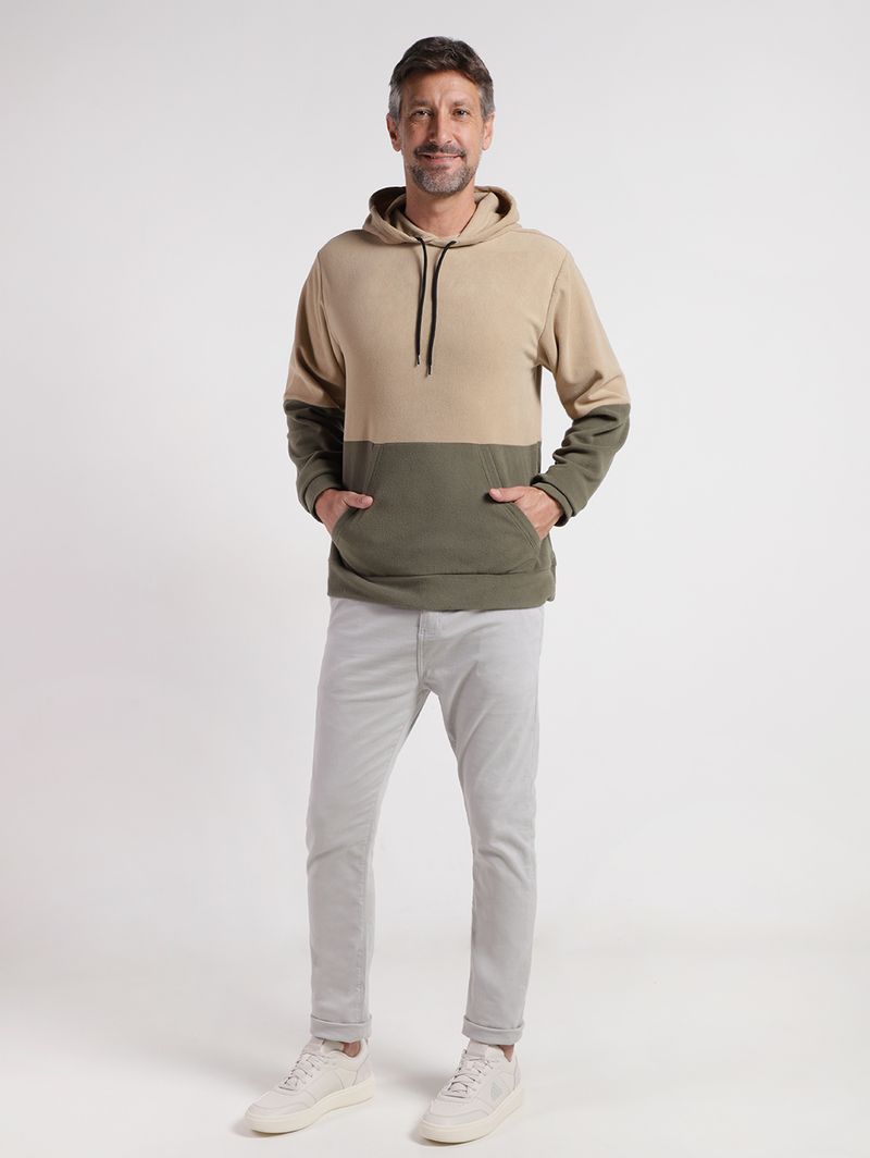 Blusão masculino confeccionado em fleece, um tecido macio que tem como função aquecer e manter a temperatura corporal. O design moderno conta com caimento confortável, capuz, mangas longas com punho e acabamentos simples. Possui bolso canguru funcional, com espaço amplo, ideal para guardar pequenos objetos. O toque final fica por conta do recorte em tom contrastante em sua parte inferior, entregando informação de moda ao seu visual. A peça perfeita para enfrentar os dias frios com elegância e praticidade!\n\nTecido: Fleece\nComposição: 100% poliéster