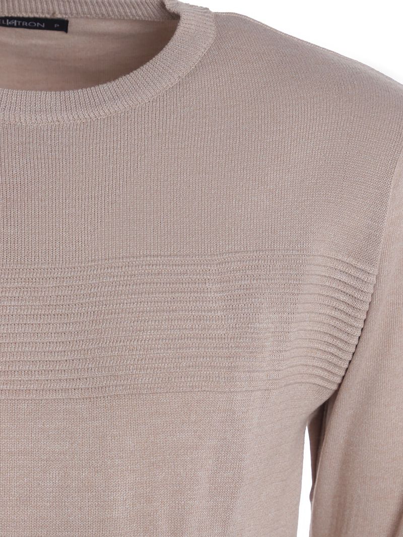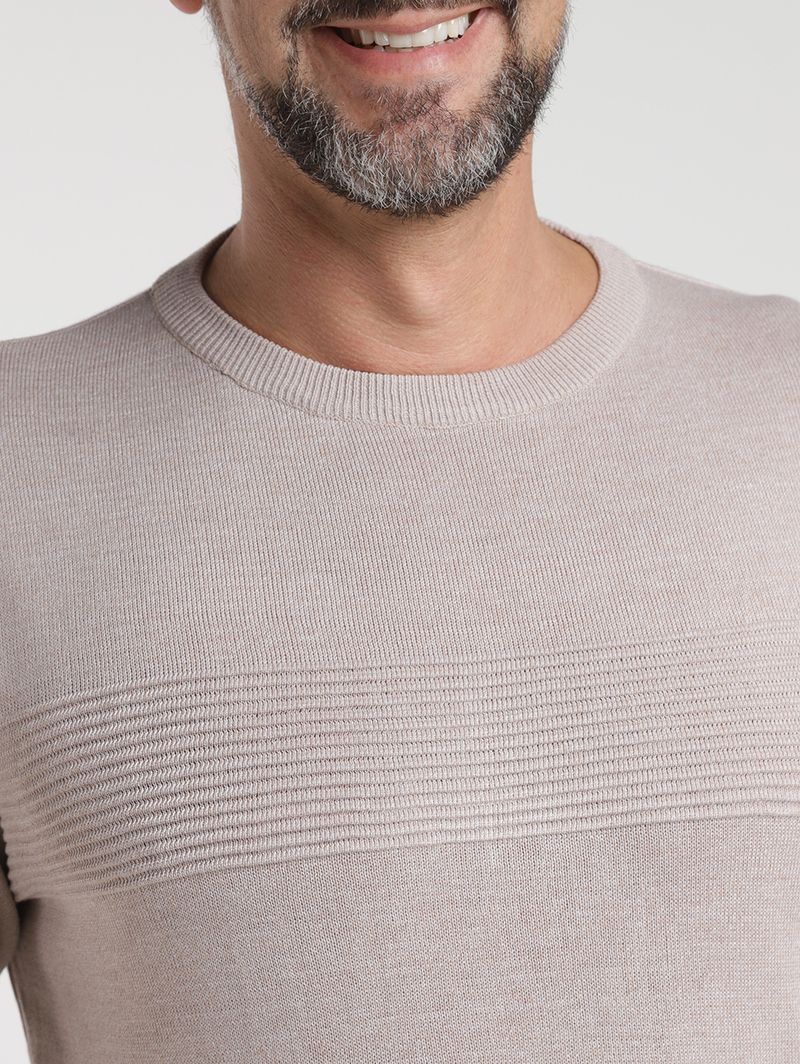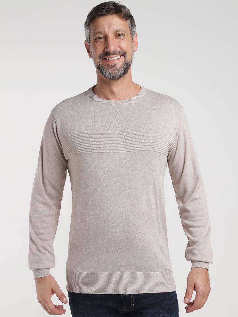 Blusão masculino desenvolvido em tricot de pontos fechados e com toque macio. O modelo apresenta gola redonda, mangas longas e acabamentos em pontos canelados. Como destaque, a peça possui textura moderna formada pelas suas tramas, que conferem um toque sofisticado e cheio de personalidade, ideal para compor looks tanto casuais quanto mais elaborados. Perfeito para quem busca elegância sem abrir mão do aconchego!\n\nMaterial: Tricot\nComposição: 100% poliéster