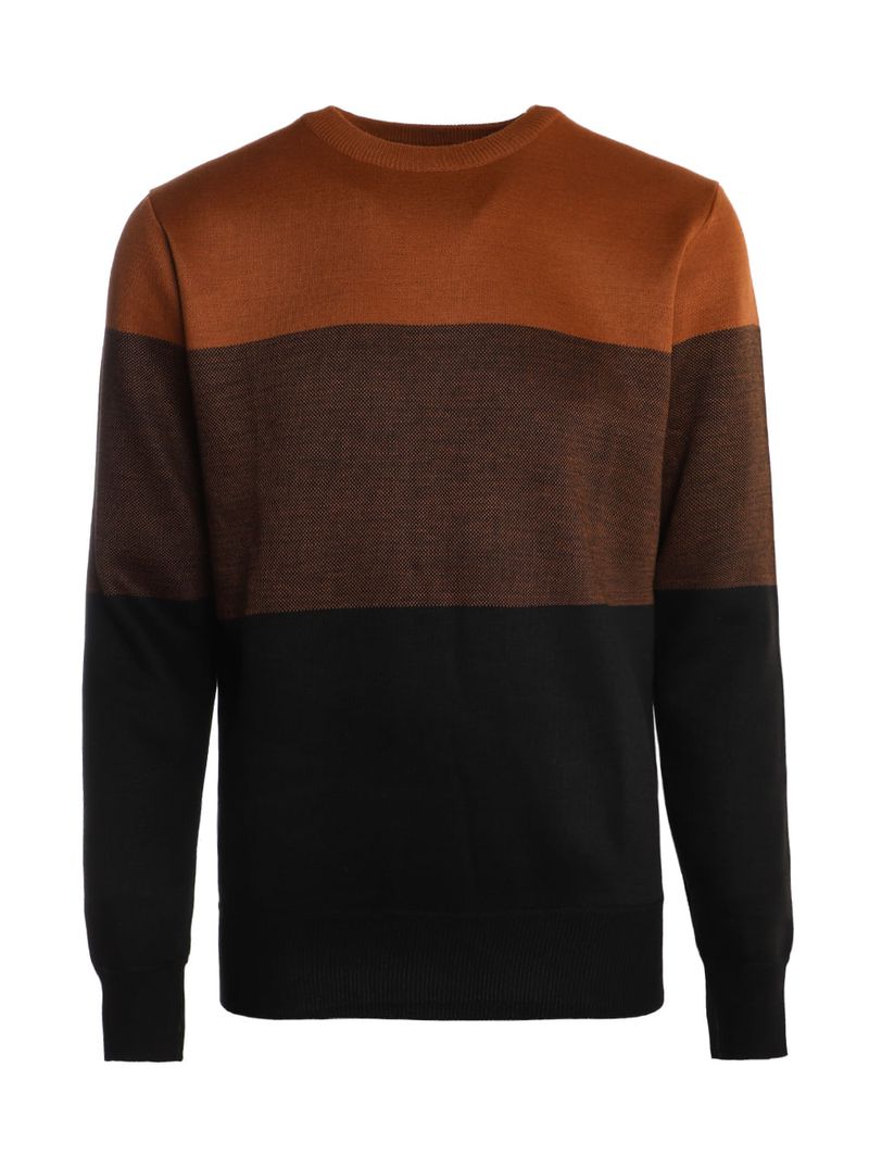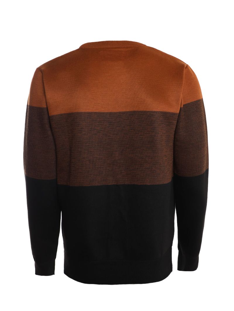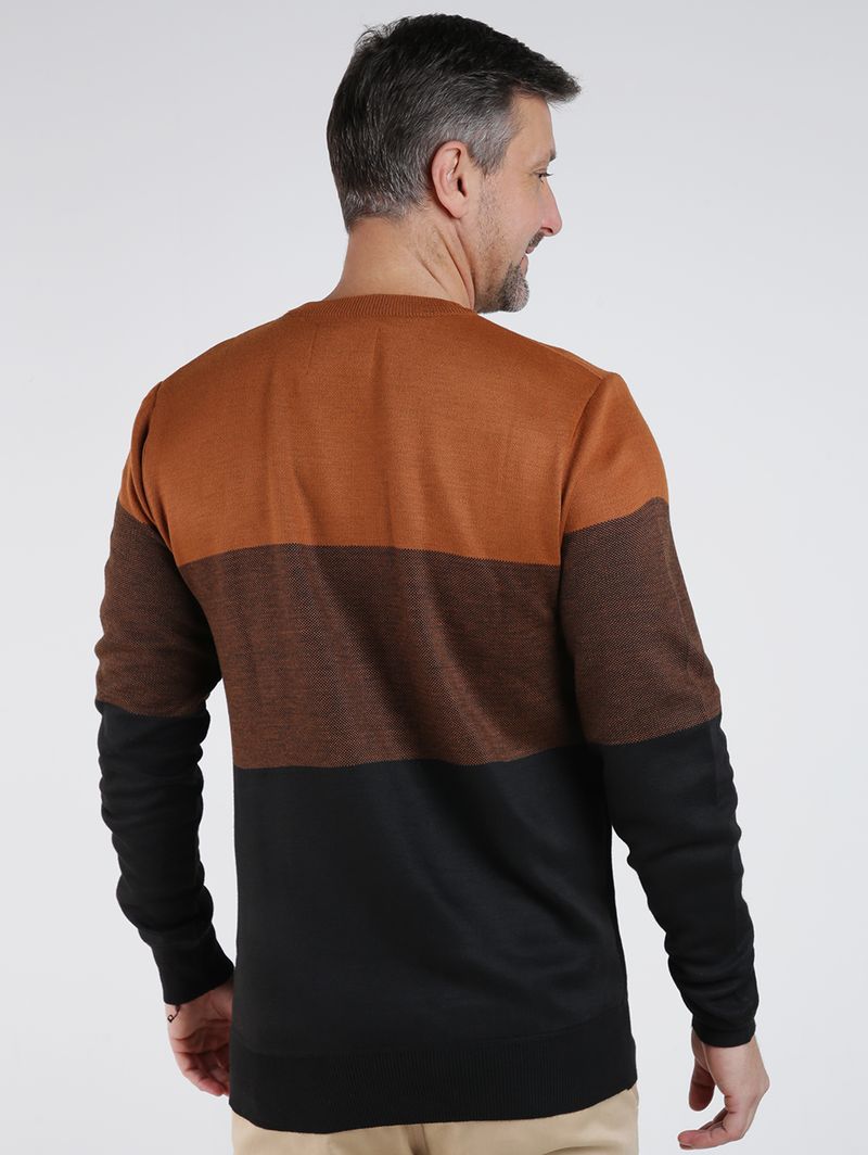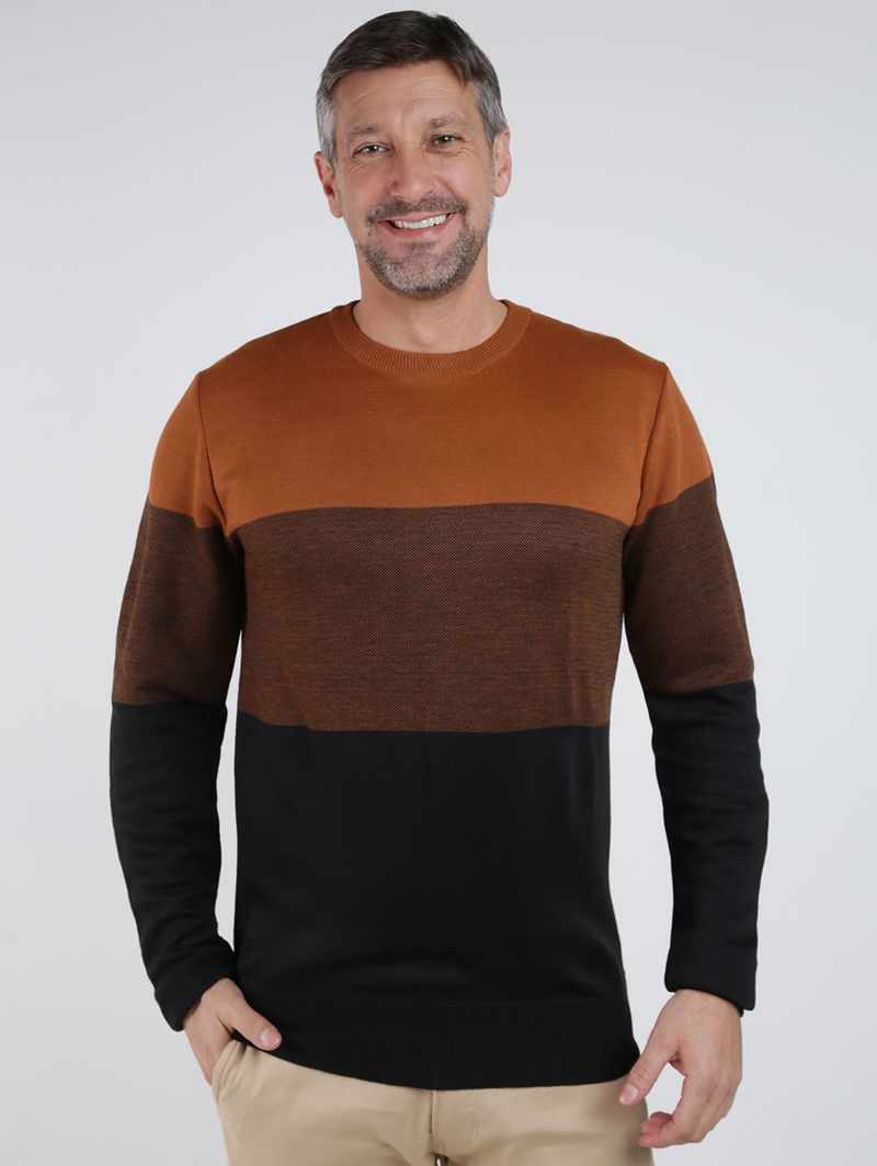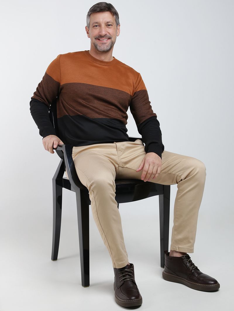 Suéter masculino desenvolvido em tricot de toque macio e aconchegante com pontos fechados. O modelo apresenta gola redonda, mangas longas e acabamentos em pontos canelados. Conta com recortes em tom contrastante que valorizam o seu visual. O suéter masculino é a peça ideal para compor looks elegantes e versáteis nos dias mais frios, aposte!\n\nMaterial: Tricot\nComposição: 100% poliéster