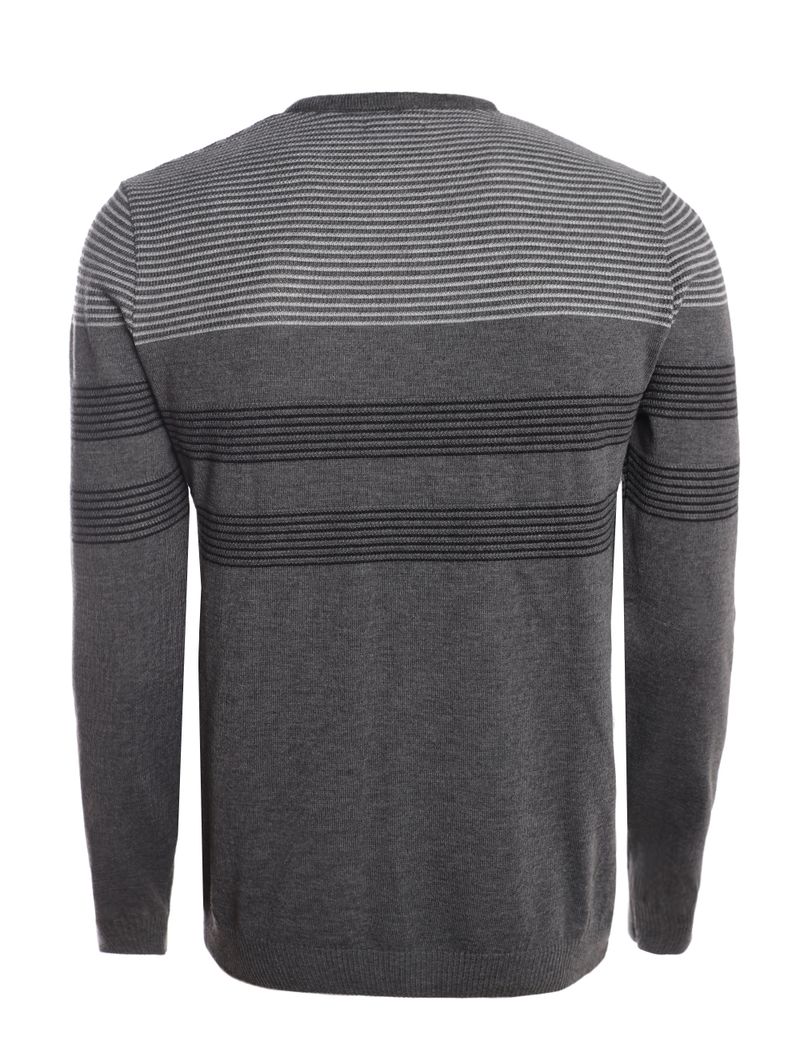 Blusão masculino desenvolvido em tricot, um tecido feito a partir do entrelaçamento de fios que forma uma estrutura canelada e com boa elasticidade. O modelo garante gola redonda, mangas compridas e barra com acabamento canelado. O seu diferencial fica por conta das listras na parte superior da peça que a deixa mais bonita. A peça perfeita para looks básicos com muito estilo!\n\nTecido: Tricot\nComposição: 95% poliéster, 03% acrílico, 02% algodão