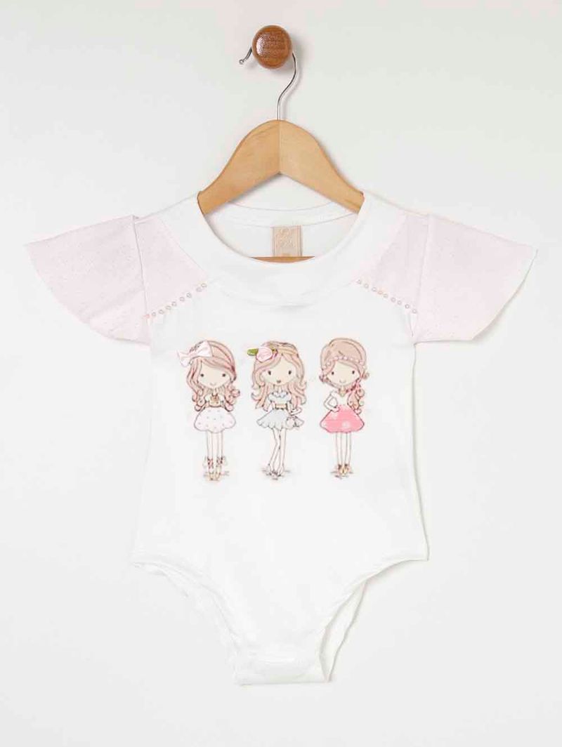 Body infantil para menina desenvolvido em malha crepe leve de toque macio. O modelo possui mangas curtas com tule em glitter e detalhe de pérolas. Apresenta estampa delicada de bonecas com aplicação de laço, flor e pérolas. Conta também com fechamento entrepernas por botões de pressão e gola redonda. Ideal para compor looks fofos para a sua menina!