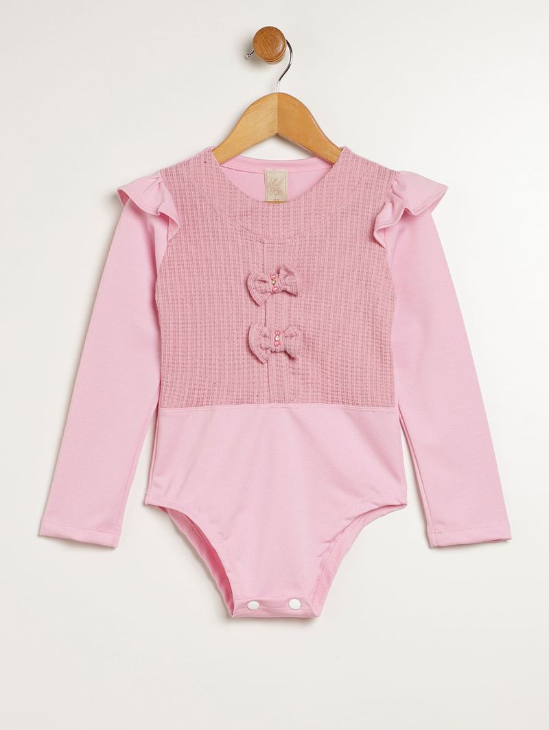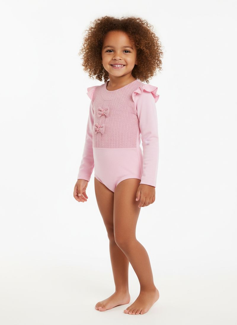 Body infantil para menina desenvolvido em malha crepe, um tecido leve e com boa elasticidade. O modelo apresenta gola redonda, mangas compridas e fechamento entrepernas por botões de pressão. O seu diferencial fica por conta do recorte na parte frontal em tecido texturizado com aplicação de laços e pedrarias, além de aplicação de babados nos ombros. Uma peça cheia de estilo que vai garantir looks incríveis para as pequenas!\n\n Tecido: Malha crepe\nComposição: 94% poliéster, 06% elastano