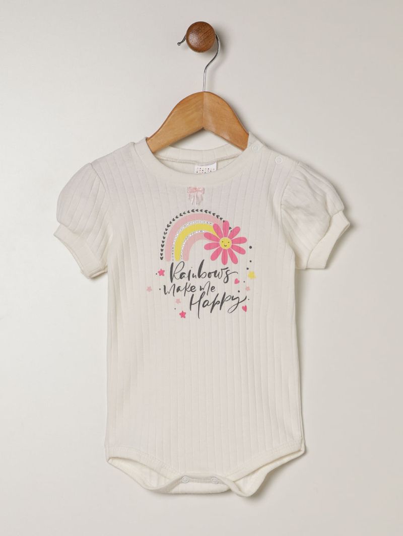 Body infantil para bebê desenvolvido em malha canelada, um tecido macio, encorpado e com textura canelada de espessura grossa pela sua extensão. Possui gola redonda com abertura no ombro por botões de pressão, mangas curtas e fechamento entrepernas por botões de pressão. Como detalhe especial, a peça apresenta estampa delicada na parte frontal. O body que vai deixar as produções do seu bebê muito mais fofas!\n\n Tecido: Malha Canelada\n Composição: 100% algodão