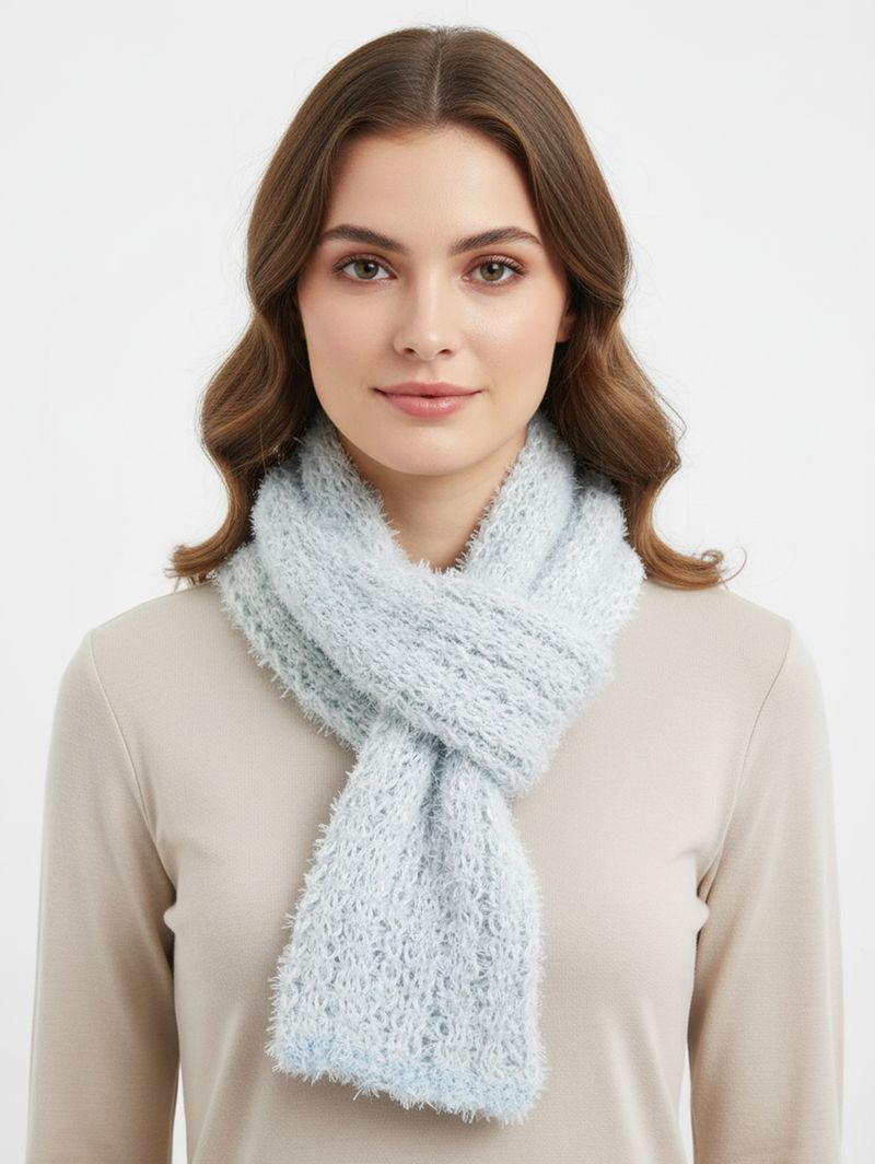 Cachecol feminino desenvolvido em tricot de pontos abertos com padronagem mesclada com aplicação de pelos sintéticos. Apresenta toque macio e caimento confortável, essencial para os dias frios da estação, aposte!
