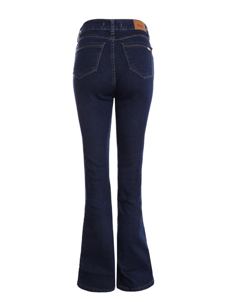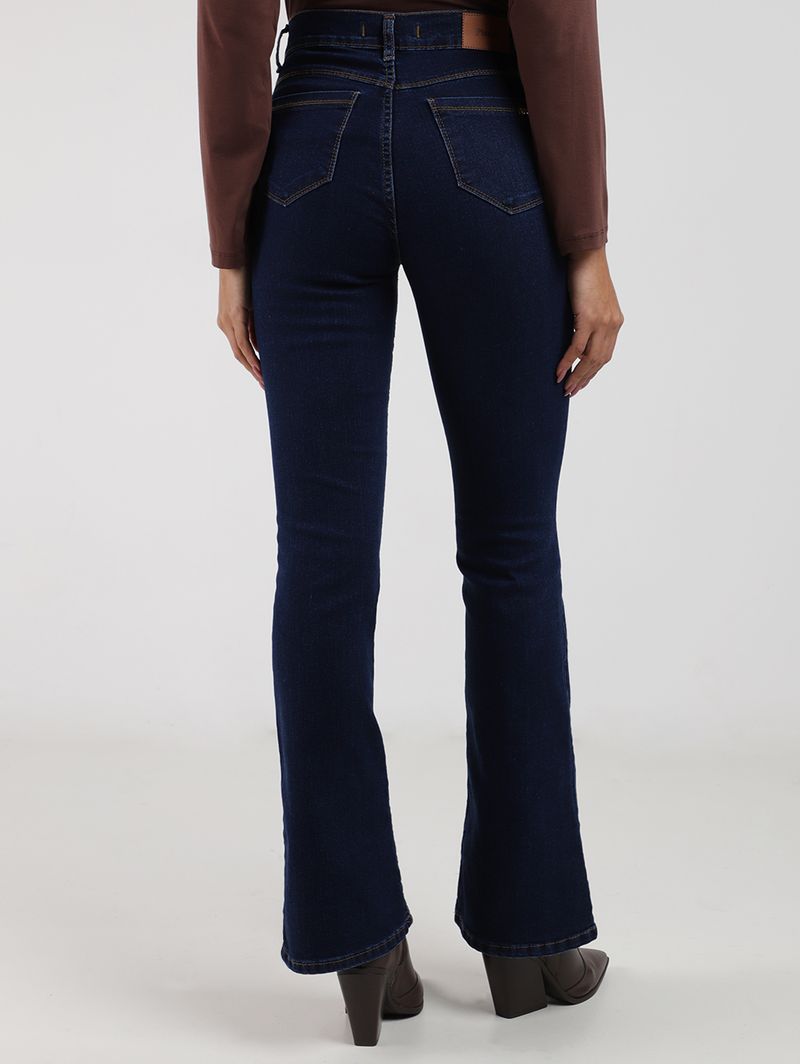 Calça feminina desenvolvida em jeans de boa qualidade com elastano em sua composição, que garante maior conforto e liberdade de movimentos. Possui modelagem flare com caimento mais ajustado e acinturado com abertura que começa a partir do joelho e se alarga até a barra. Apresenta lavagem tradicional, fechamento frontal por zíper e botão, cintura média, cós com passantes para cinto e bolsos frontais decorativos e posteriores funcionais. A calça que vai elevar suas produções do dia a dia, aposte!\n\nTecido: Jeans\nLavagem: Tradicional\nModelagem: Flare\nComposição: 84% algodão, 14% poliéster, 02% elastano