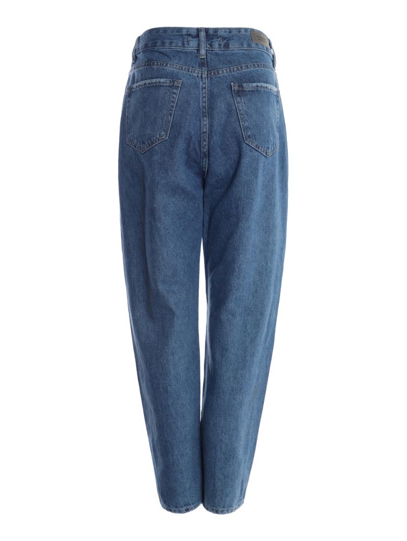 Calça feminina desenvolvida em jeans de algodão, um tecido encorpado e sem elasticidade. Apresenta modelagem mom jeans, uma modelagem, característico pelo quadril soltinho e pernas levemente afuniladas e lavagem tradicional. Possui cintura alta, cós com passantes para cinto, pences na parte frontal, fechamento frontal por botão de casa e zíper, bolsos frontais e posteriores funcionais, além de barra com acabamento em fio. Conforto vintage com toque moderno, a calça que valoriza suas curvas e combina com tudo!\n\nTecido: Jeans\nModelagem: Mom\nComposição: 100% algodão