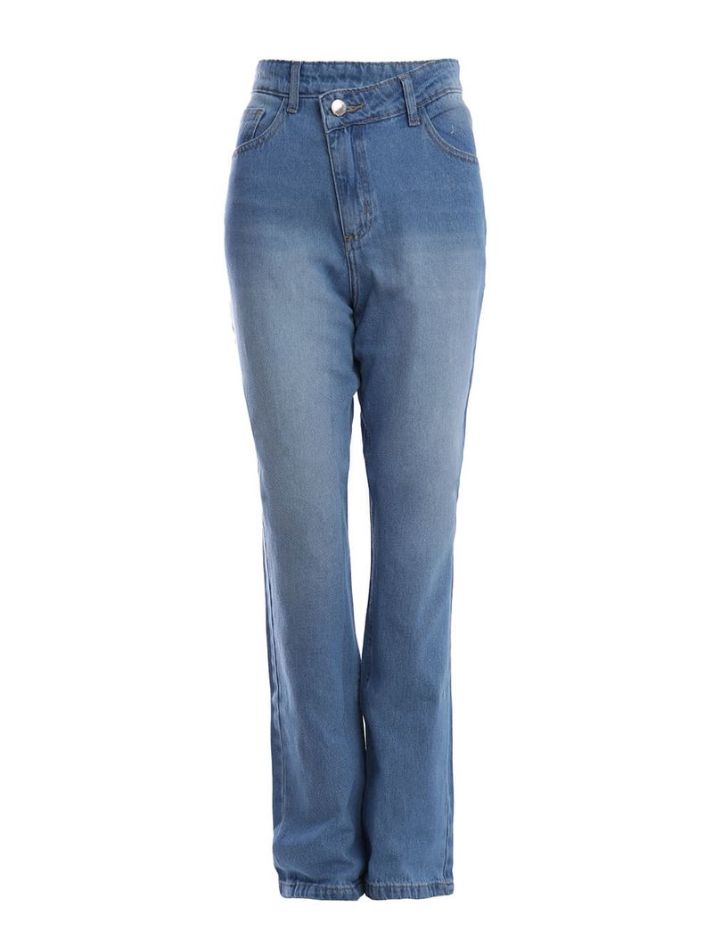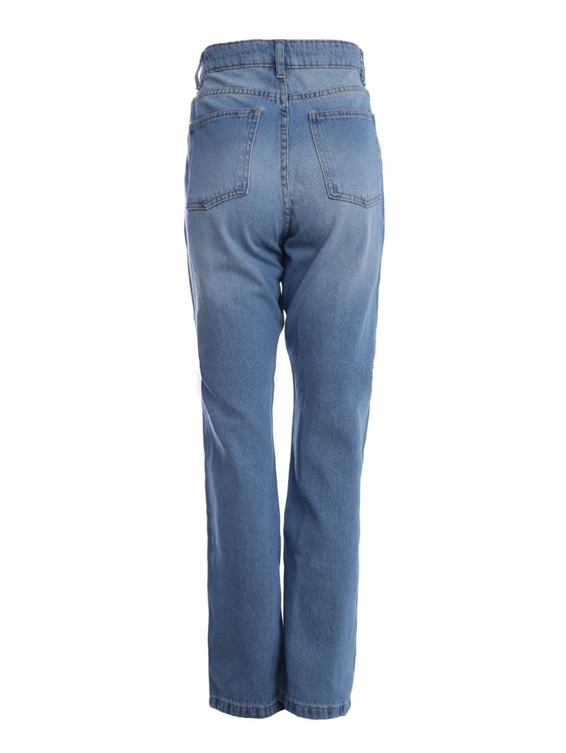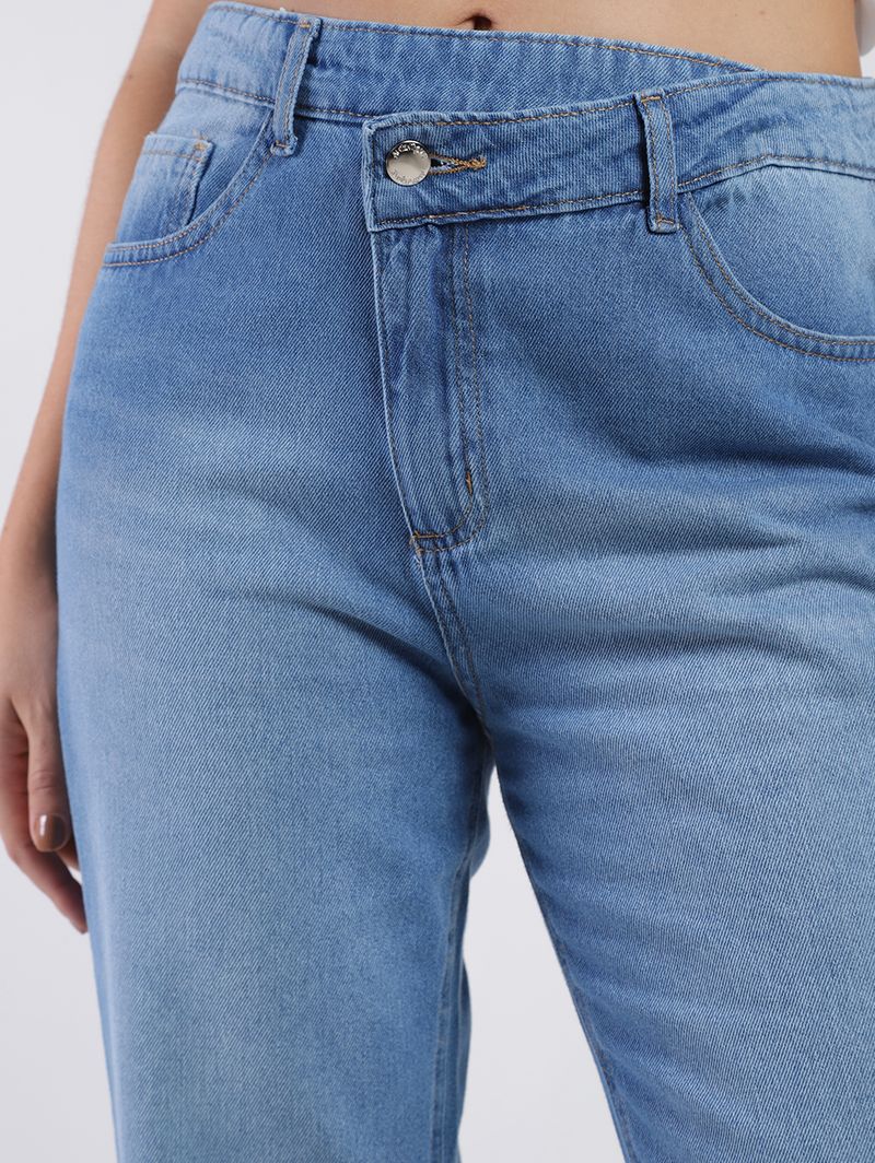 Calça feminina desenvolvida em jeans de lavagem estonada, um tecido de algodão que promove um toque macio e boa resistência. Possui modelagem reta que oferece um corte clássico e atemporal, proporcionando conforto e liberdade de movimento, seu caimento segue a linha natural do corpo, sem apertar. Apresenta cintura alta, cós com passantes para cinto, fechamento frontal por botão de casa e zíper e acabamentos simples com costuras em tom contrastante. Conta com bolsos frontais e posteriores funcionais. Como destaque, a peça possui cós deslocado, trazendo um toque fashionista ao seu visual. A calça reta é uma escolha que nunca sai de moda, valorizando todos os tipos de silhueta com um toque de sofisticação e estilo!\n\nTecido: Jeans\nLavagem: Estonada\nModelagem: Reta\nComposição: 100% algodão