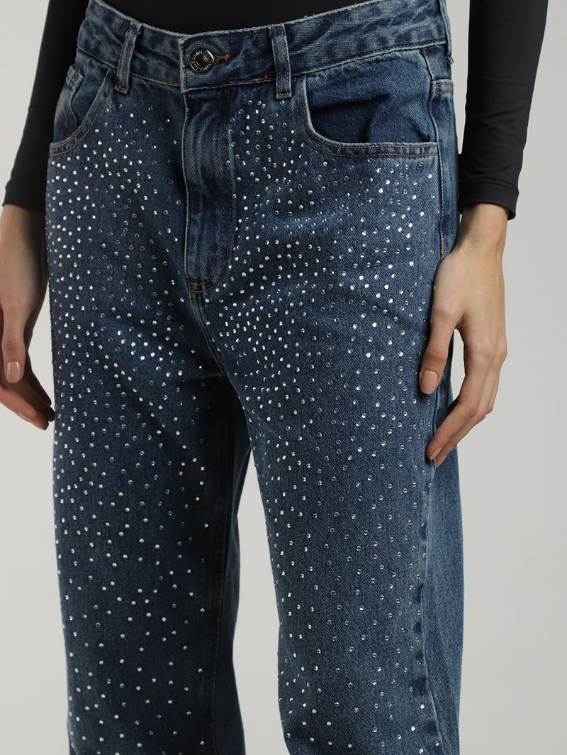Calça feminina desenvolvida em jeans de algodão, um tecido macio e confortável, além de um excelente caimento. Apresenta lavagem escura com estonações e modelagem reta, característica por um estilo super sofisticado e elegante. Apresenta cintura alta, cós com passantes para cinto, fechamento frontal por botão de casa e zíper, bolsos frontais e posteriores funcionais, além de barra com acabamento simples. O seu diferencial fica por conta da aplicação de hotfix na parte frontal, ou seja, pequenos brilhos que garantem à peça um toque glamuroso. A peça que vai transformar looks básicos com muita personalidade e estilo!\n\n Tecido: Jeans\nModelagem: Reta\nLavagem: Estonada\nComposição: 100% algodão