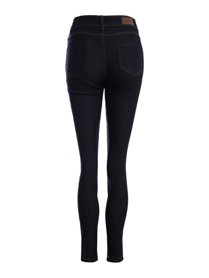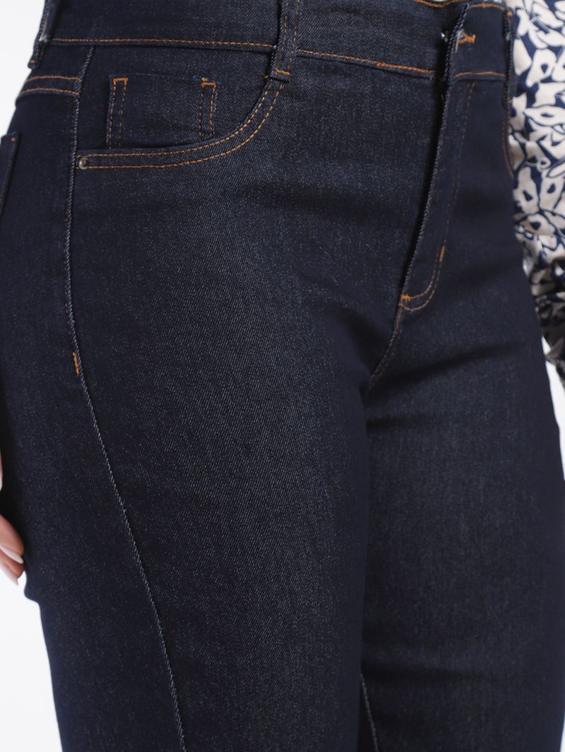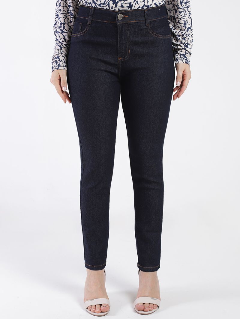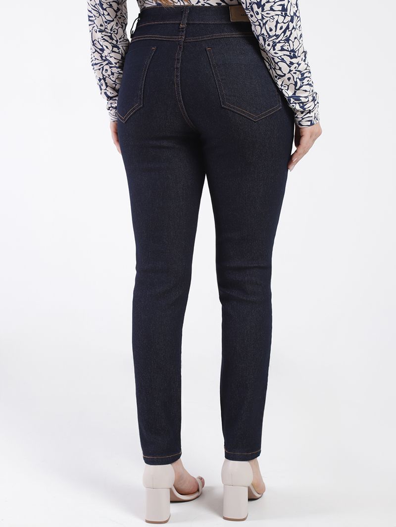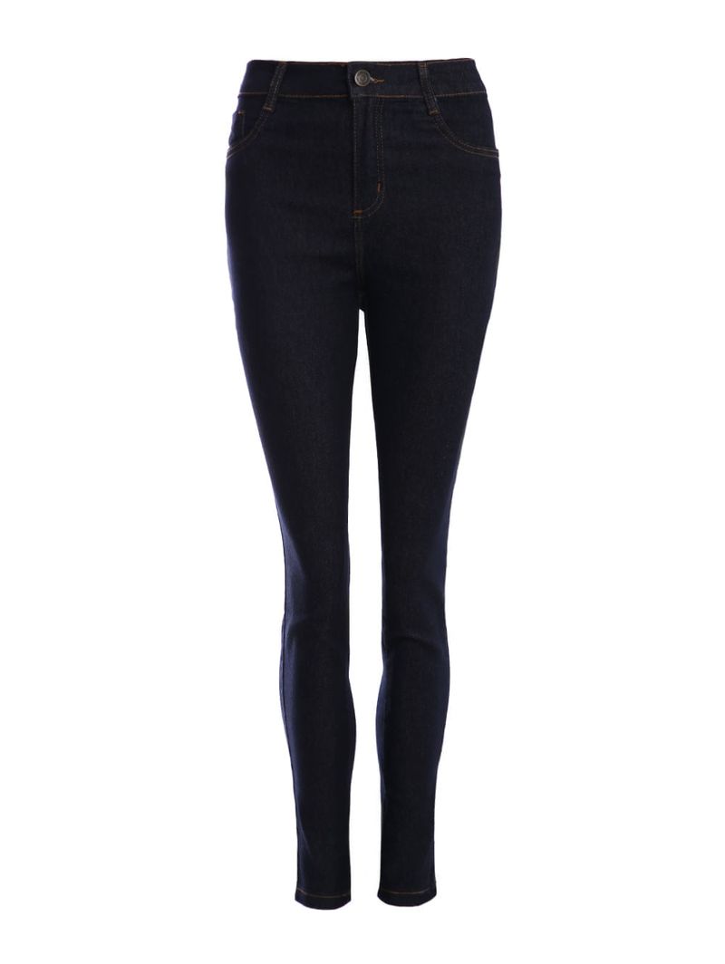 Calça feminina desenvolvida em jeans, um tecido leve e com uma pequena porcentagem de elastano que garante mais conforto ao se movimentar. Apresenta lavagem escura e modelagem skinny, uma calça mais ajustada ao corpo, com corte justo desde o quadril até a barra. Possui cintura alta, cós com passantes para cinto, fechamento frontal por botão de casa e zíper, bolsos frontais decorativos e posteriores funcionais, além de barra com acabamento simples. O seu diferencial fica por conta de costuras em tom contrastante. A calça skinny é uma peça atemporal e curinga no guarda-roupas, podendo ser usada tanto com tênis para um visual despojado ou com salto alto para um looks mais elegante!\n\nTecido: Jeans\nModelagem: Skinny\nLavagem: Escura\nComposição: 78,5% algodão, 20% poliéster, 1,5% elastano