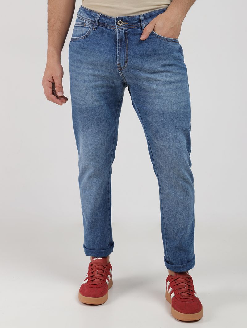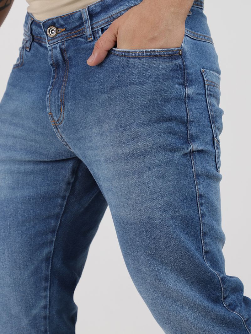 Calça masculina desenvolvida em jeans com elastano em sua composição que garante mais conforto e mobilidade. Possui modelagem slim com caimento ajustado na medida certa, sem ser muito justa ou muito larga. Apresenta cós com passantes para cinto, fechamento frontal por botão de casa e zíper e acabamentos simples com costuras no tom. Conta com bolsos frontais e posteriores funcionais. Sua lavagem é estonada, conferindo um toque de estilo à peça. Aquela calça curinga que não pode faltar no guarda-roupas masculino!\n\nTecido: Jeans\nLavagem: Estonada\nModelagem: Slim\nComposição: 98% algodão, 02% elastano