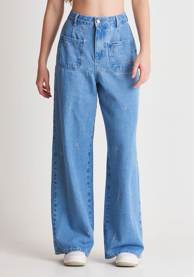 A calça jeans wide leg possui bolsinhos frontais e bordado ¿ a tendência de bolsos frontais tem ganhado destaque nas coleções de moda, trazendo funcionalidade e estilo à peça. Possui bordado com ícone de sol, na cor branca. Jeans 100% algodão, com lavanderia clara e bordados de sol ao longo de toda a parte da frente da calça.