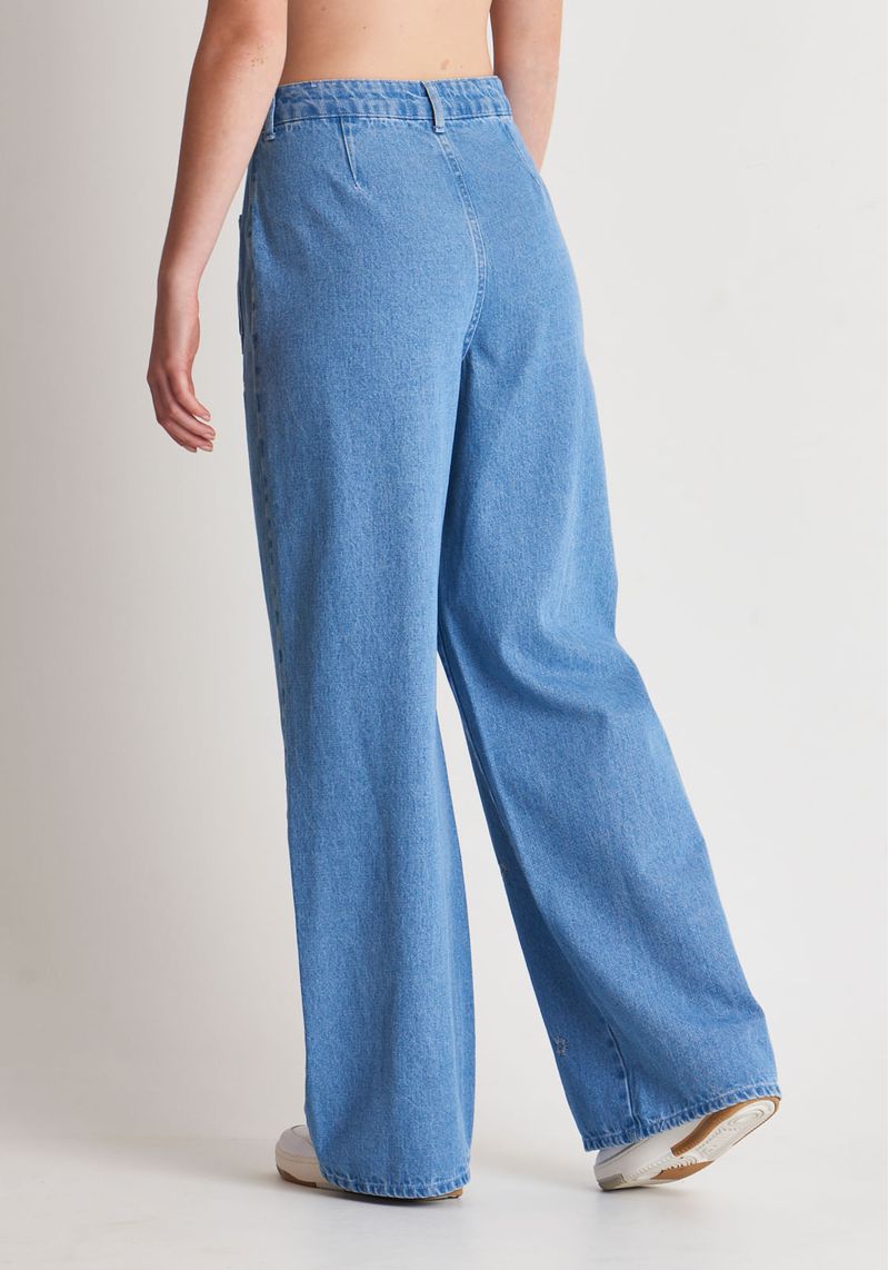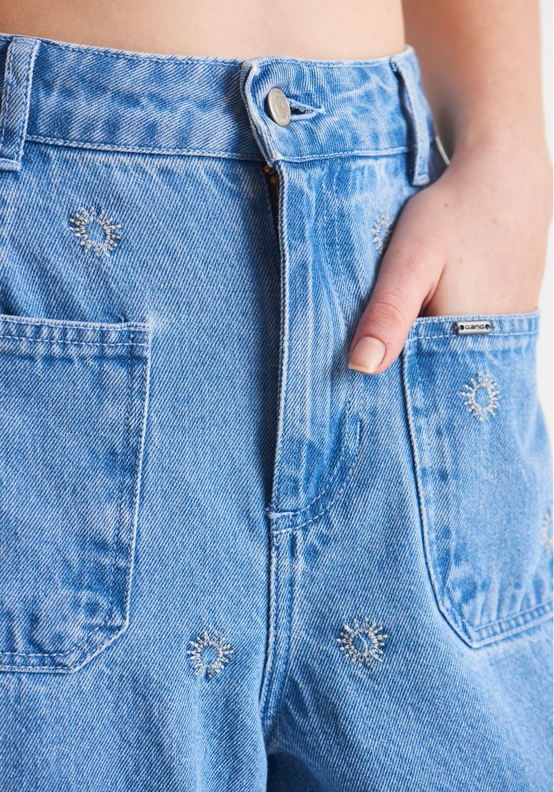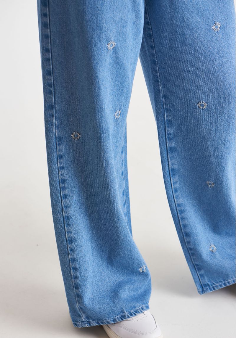 A calça jeans wide leg possui bolsinhos frontais e bordado ¿ a tendência de bolsos frontais tem ganhado destaque nas coleções de moda, trazendo funcionalidade e estilo à peça. Possui bordado com ícone de sol, na cor branca. Jeans 100% algodão, com lavanderia clara e bordados de sol ao longo de toda a parte da frente da calça. modelo veste: bottom 38 | top P altura: 1,78cm | busto: 83cm | cintura: 62cm | quadril: 93cm