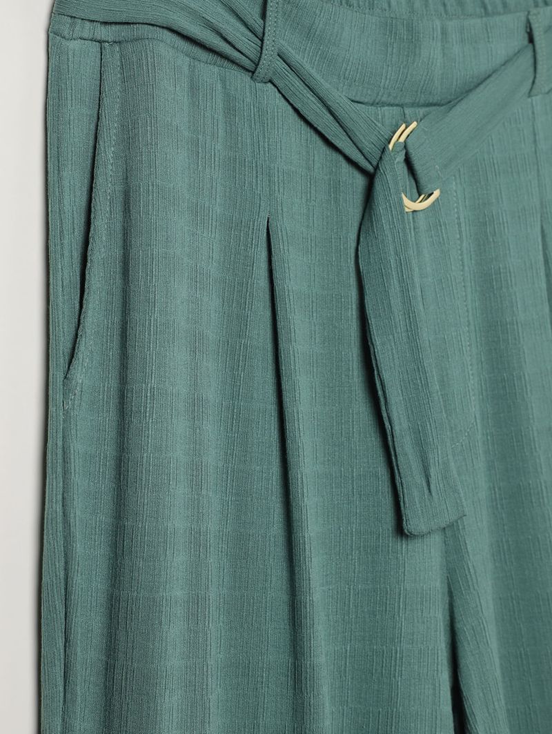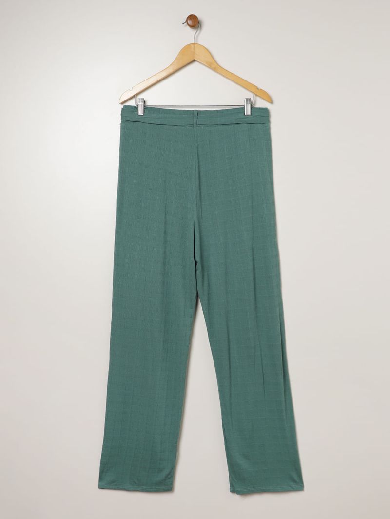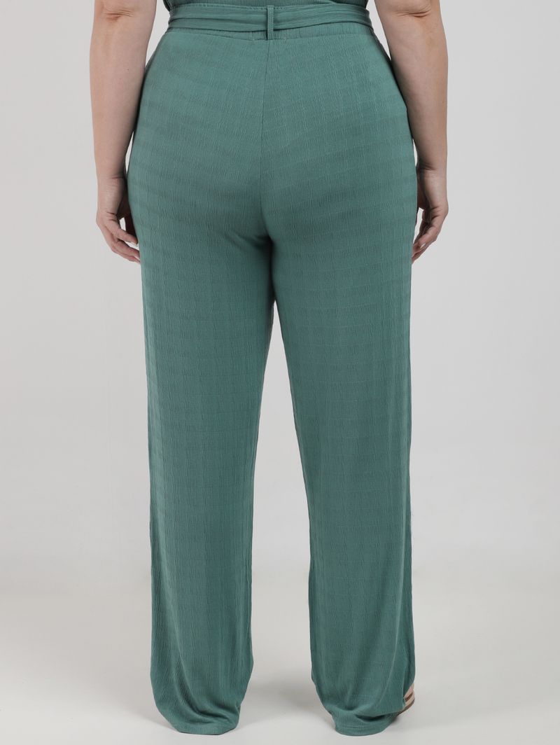 Calça feminina desenvolvida em malha texturizada, um tecido macio e resistente, com textura sutil pela sua extensão, detalhe que traz um charme extra ao seu visual. O modelo wide leg se caracteriza por seu caimento amplo e confortável que começa no quadril e se estende até a barra. Possui cós elástico, passantes para cinto, pregas frontais e barra com acabamento simples. Acompanha cinto no mesmo tecido da peça com fivelas em meia lua. Uma peça que une conforto e estilo, com caimento moderno que valoriza sua produção em qualquer ocasião!\n\n Tecido: Malha Texturizada\nComposição: 98% viscose, 02% elastano