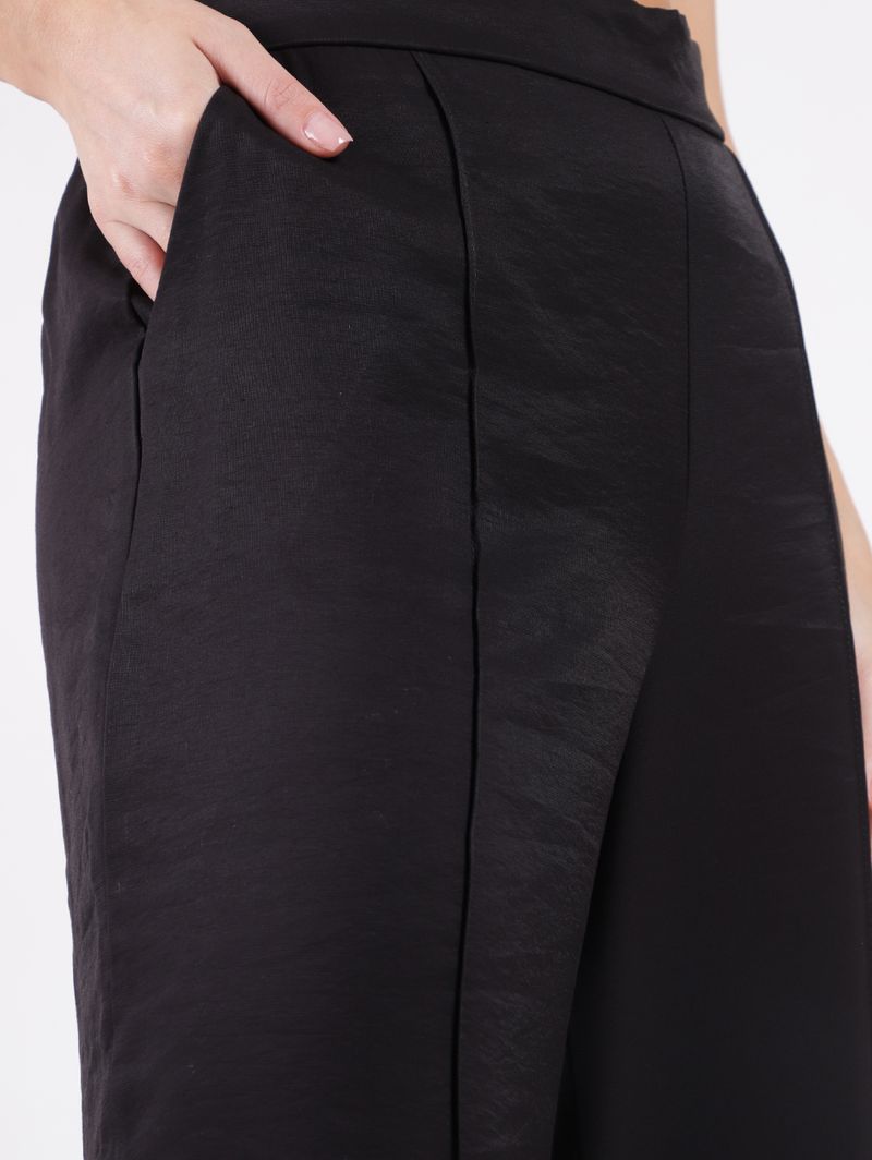 Calça feminina desenvolvida em tecido fresh jacquemus, um tecido plano de viscose e poliéster, com trama mais encorpada e ondulações sutis. O modelo de alfaiataria possui modelagem pantalona com corte reto e caimento leve e fluido. Conta com forro em 100% poliéster, cintura alta, fechamento por zíper lateral e aplicação em elástico em sua parte posterior. Apresenta nervuras frontais, um detalhe que traz estrutura e sofisticação à peça, alongando a silhueta. Seus bolsos frontais são funcionais. A escolha perfeita para quem busca por um estilo moderno, mas sem abrir mão do conforto!\\n\\n Tecido: Fresh Jacquemus\\n Modelagem: Pantalona\\n Composição: 89% viscose, 11% poliéster\\n Composição Forro: 100% poliéster\\n Medidas da modelo: 1,72 de altura, 60kg e usa tamanho P.