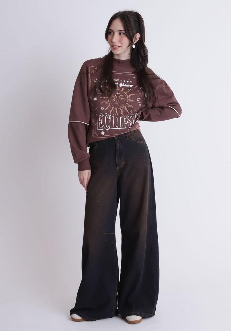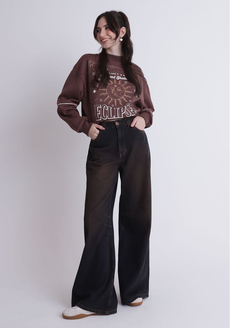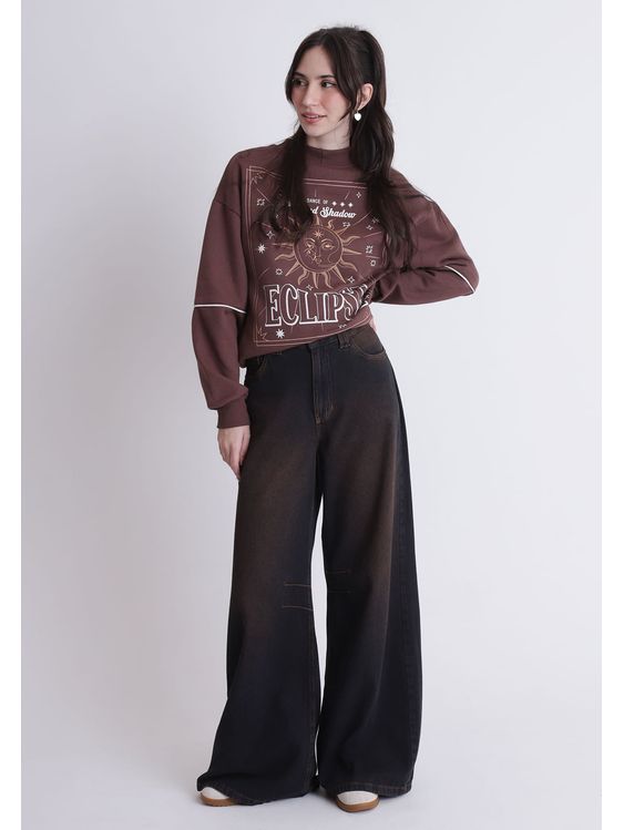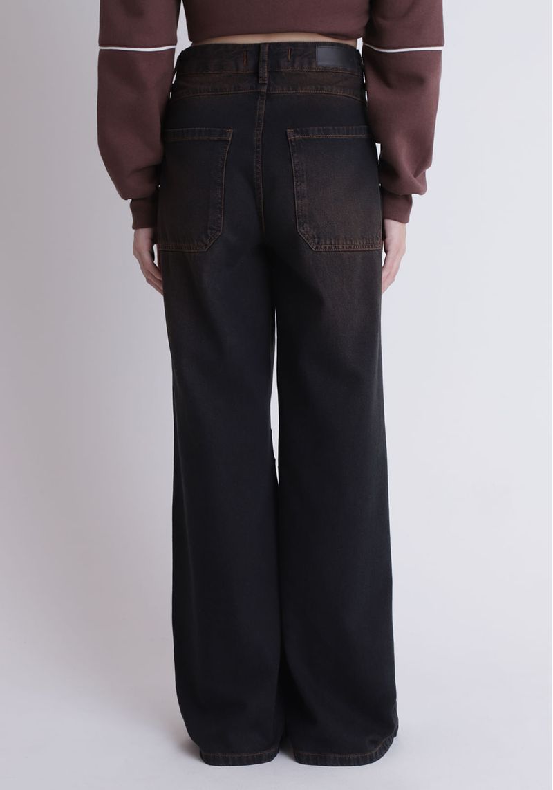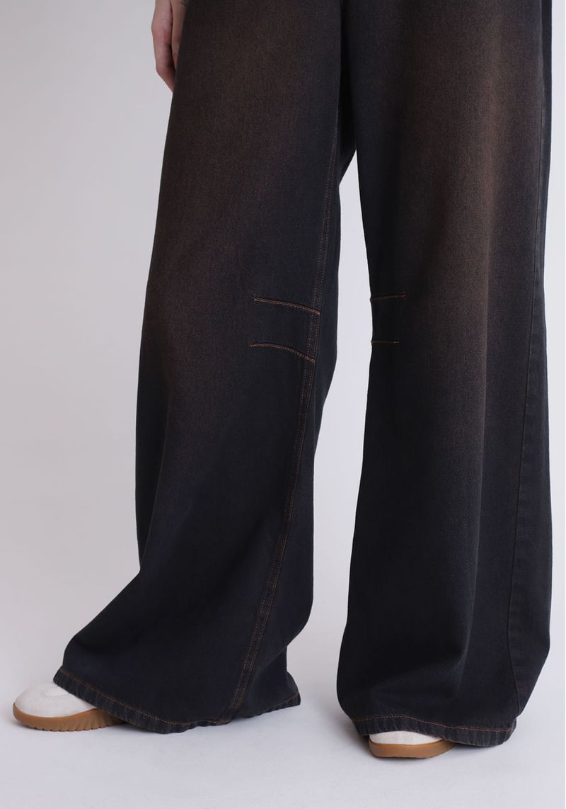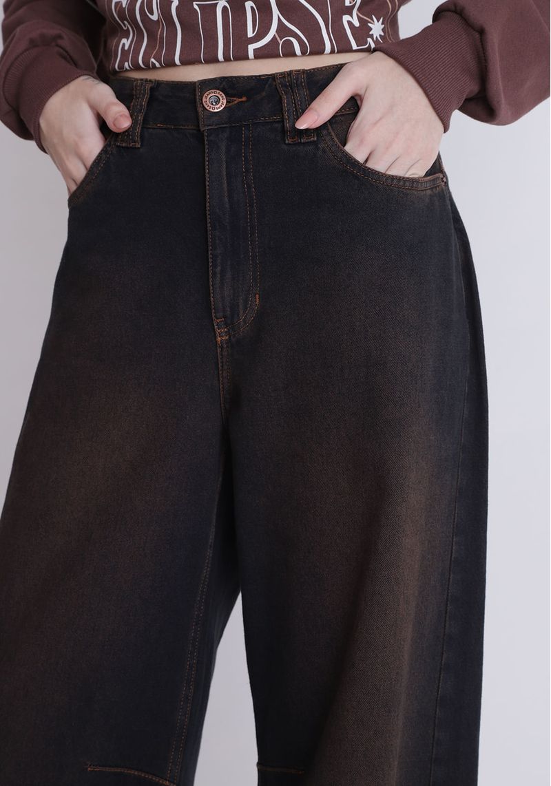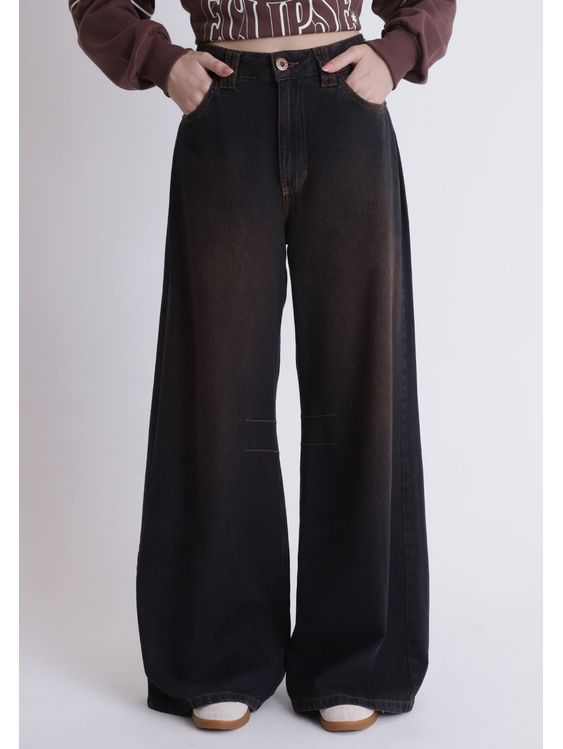 Calça jeans super baggy, confeccionada em jeans 100% algodão, com modelagem super baggy (bem larga, e solta), possui cintura média. Com lavanderia preta e tingimento marrom.