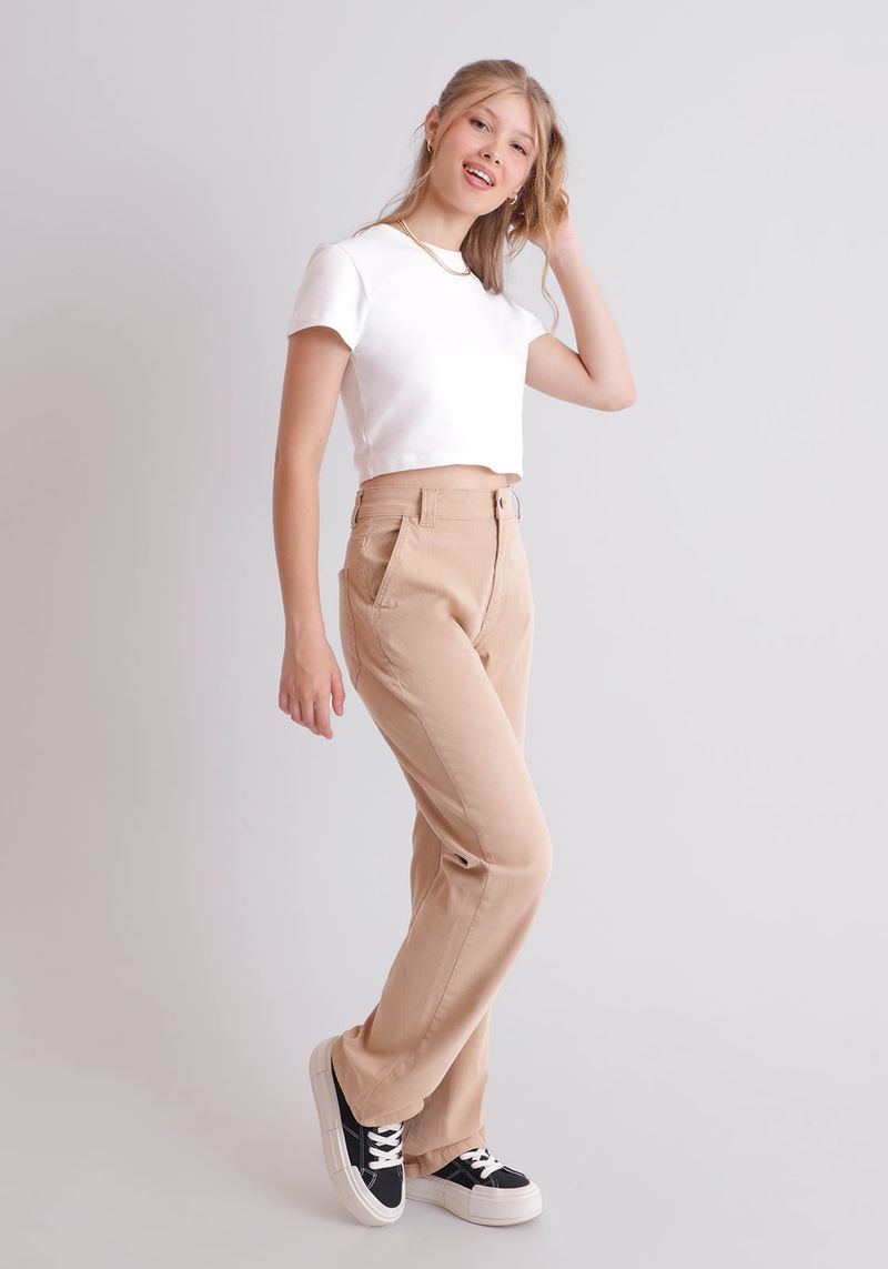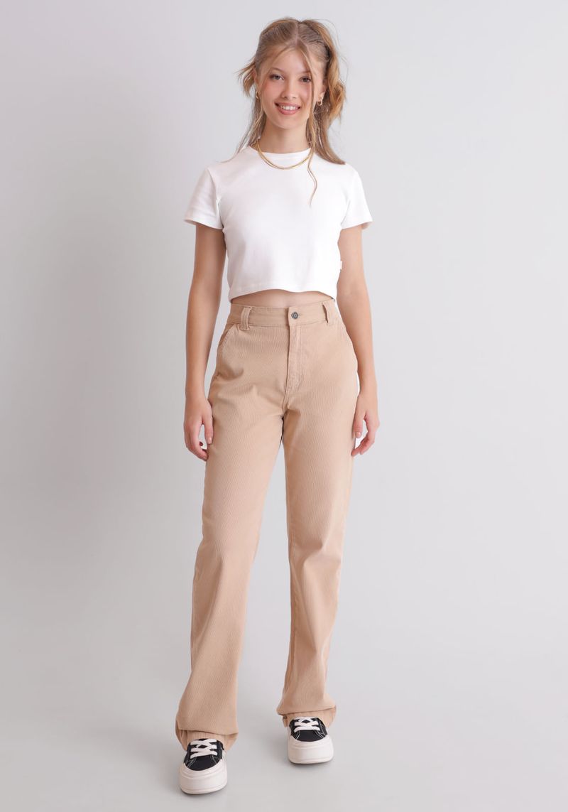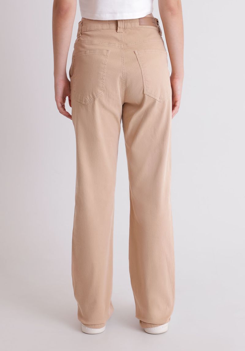 Calça em veludo cotelê, confeccionada em algodão com elastano, com modelagem wide leg, na cor natural. O veludo cotelê é uma ótima escolha para compor looks com visual mais invernal.