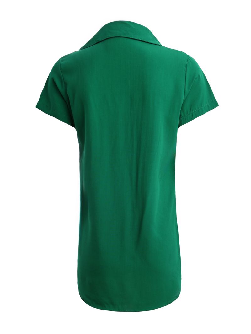 Camisa feminina desenvolvida em tecido plano . O modelo apresenta comprimento alongado , gola de ponta, mangas curtas e fechamento frontal por botões de casa. Sua barra é arredondada e tem acabamento simples.