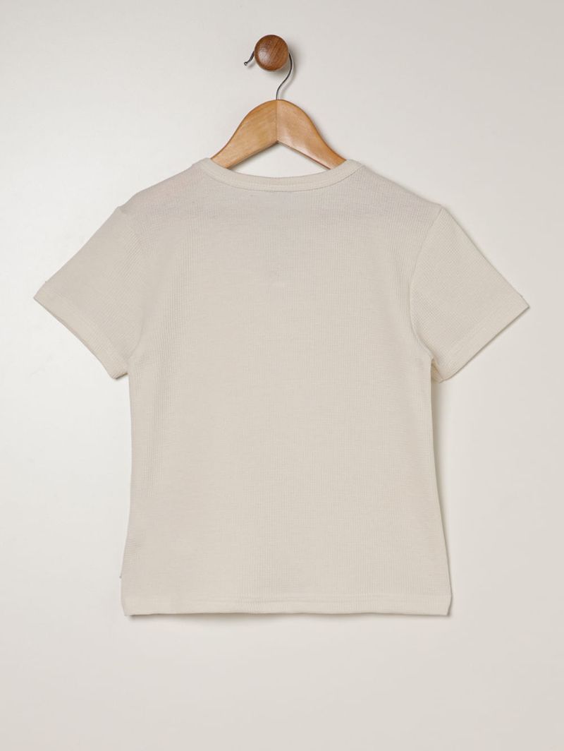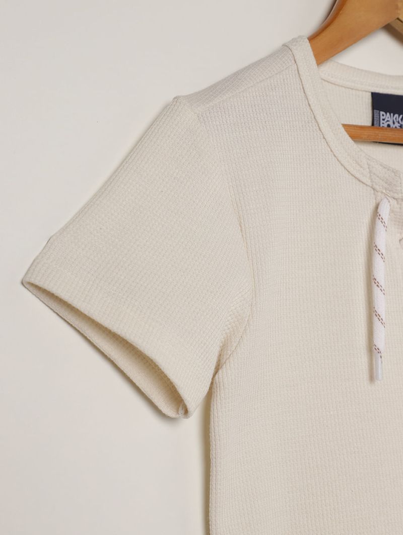 Camiseta infantil para menino desenvolvida em malha texturizada, um tecido macio e com textura sutil pela sua extensão. O modelo apresenta caimento regular, gola redonda com detalhe de amarração, mangas curtas e acabamentos simples. A camiseta moderna que vai dar um up nas produções casuais do seu menino!\n\nTecido: Malha Texturizada\nComposição: 50% algodão, 50% poliéster