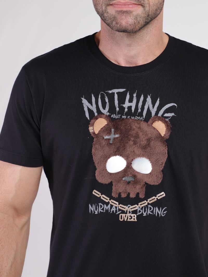 Camiseta masculina desenvolvida em meia malha, um tecido leve e respirável, com toque macio. O modelo possui gola redonda com reforço interno que assegura a durabilidade da peça, mangas curtas e acabamentos simples com costuras no tom. Apresenta como destaque a estampa frontal com aplicação em pelos sintéticos, adicionando um toque de estilo descontraído e ousado ao visual. A camiseta ideal para quem quer fugir do comum e se destacar com estilo!\n\nTecido: Meia Malha\nComposição: 100% algodão