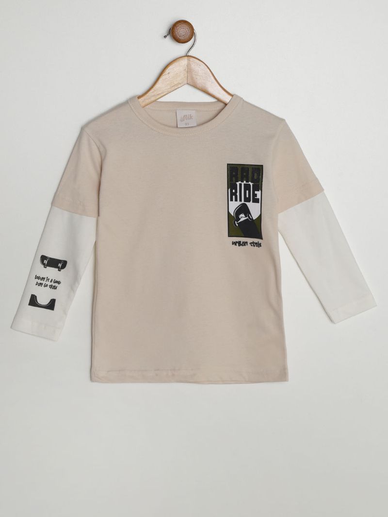 Camiseta infantil para menino confeccionada em meia malha 100% algodão, oferecendo toque macio, respirabilidade e conforto para acompanhar a rotina dos pequenos. Possui gola redonda, mangas longas com sobreposição em tom contrastante e acabamentos simples, criando um visual moderno e cheio de estilo. O diferencial fica por conta da estampa em silk aplicada na altura do peito, que adiciona personalidade à peça de forma discreta e atual. Versátil e confortável, é uma camiseta que combina facilmente com diferentes looks e desperta a vontade de usar sempre, seja para a escola, passeios ou momentos de lazer!\n\n Tecido: Meia Malha\n Composição: 100% algodão