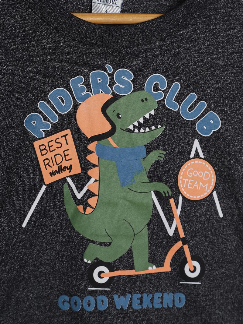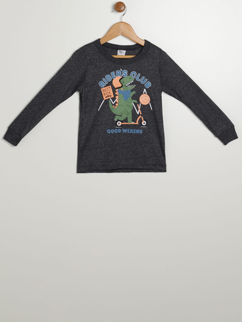Camiseta infantil para menino desenvolvida em malha com algodão e poliéster, proporcionando conforto, toque macio e maior durabilidade para o uso diário. Possui gola redonda, mangas longas e acabamento simples, garantindo caimento leve e liberdade de movimento. O diferencial fica por conta da estampa divertida de dinossauro andando de patinete, que adiciona um toque lúdico e cheio de personalidade ao visual. Com design casual e versátil, é uma peça prática para acompanhar as aventuras do dia a dia com muito estilo!n\n\n Tecido: Malha Composição: 62% algodão, 38% poliéster