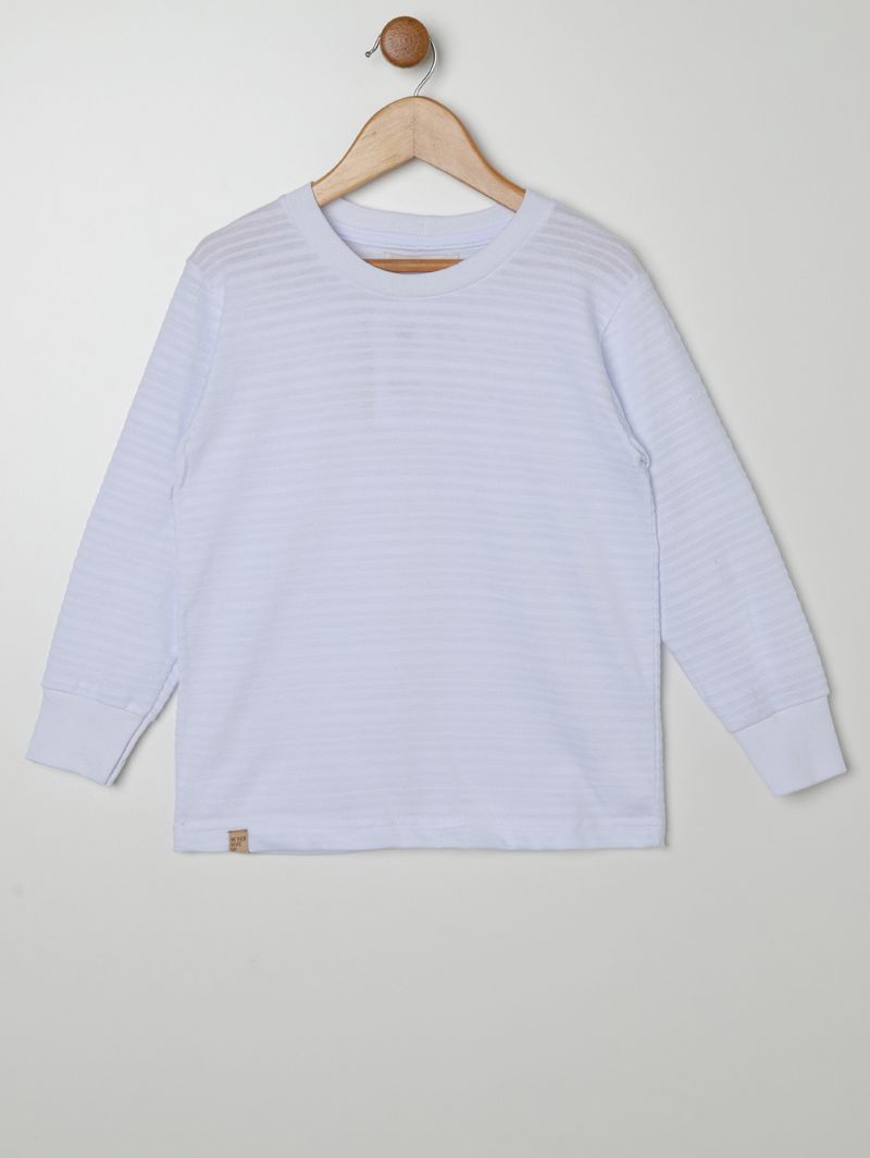 Camiseta infantil para menino desenvolvida em malha texturizada, combinando algodão e poliéster para garantir conforto, maciez e maior durabilidade. Possui gola redonda, mangas longas com punho e acabamento simples, oferecendo caimento confortável e proteção extra nos dias mais fresquinhos. Com design casual e proposta básica, é uma peça versátil que combina facilmente com diferentes looks do dia a dia, acompanhando a rotina dos pequenos com praticidade e bem-estar!\n\n Tecido: Malha texturizada\n Composição: 75% algodão, 25% poliéster