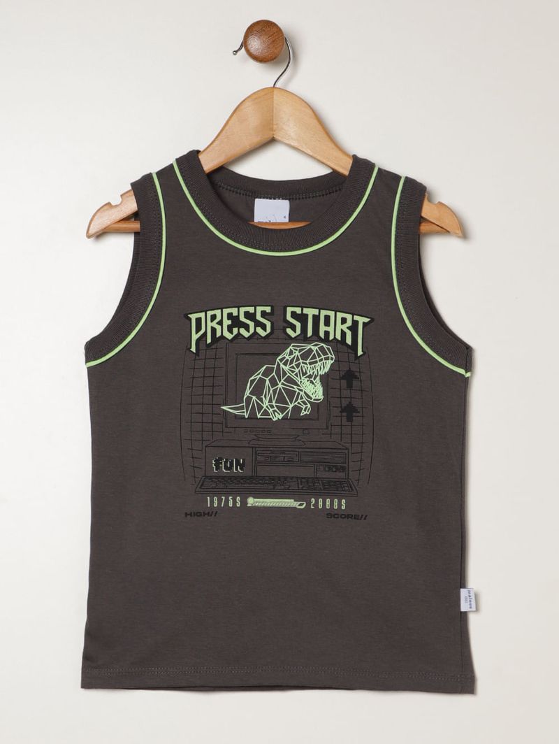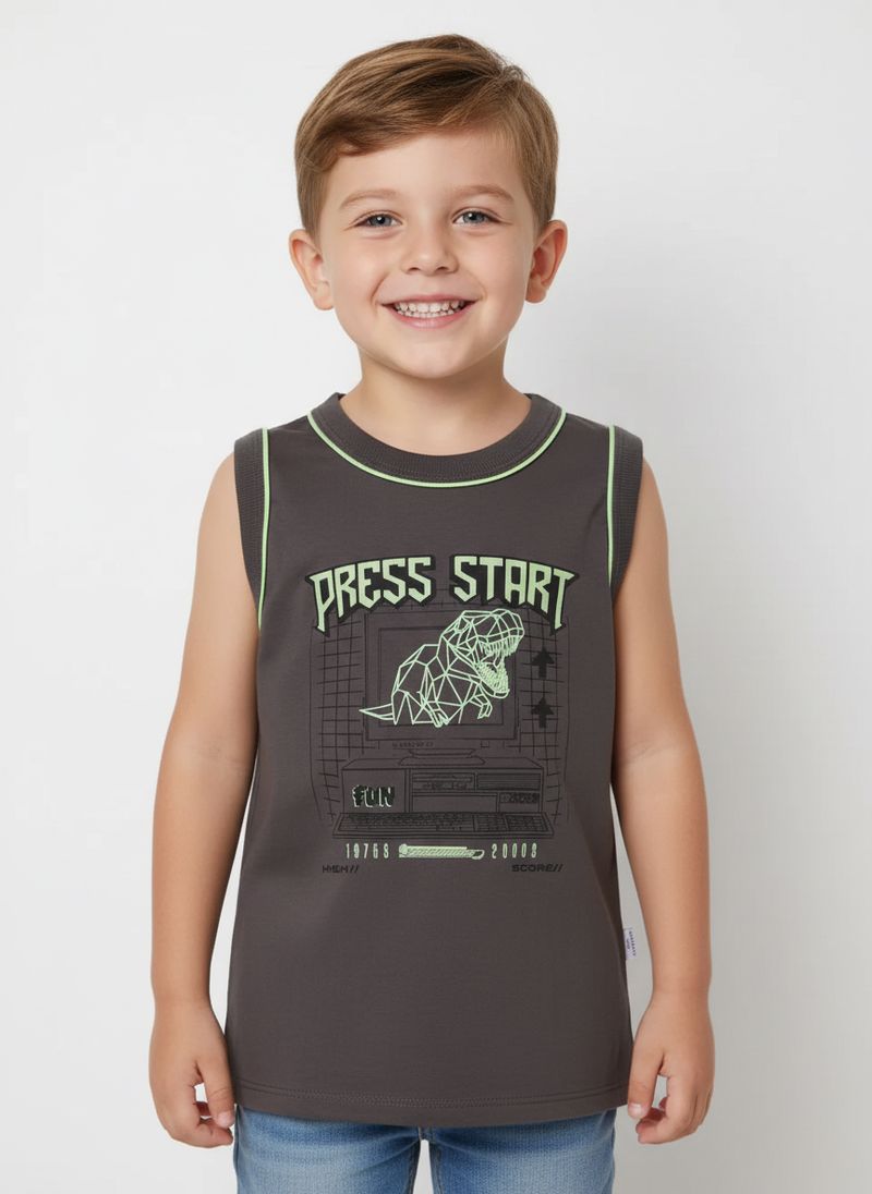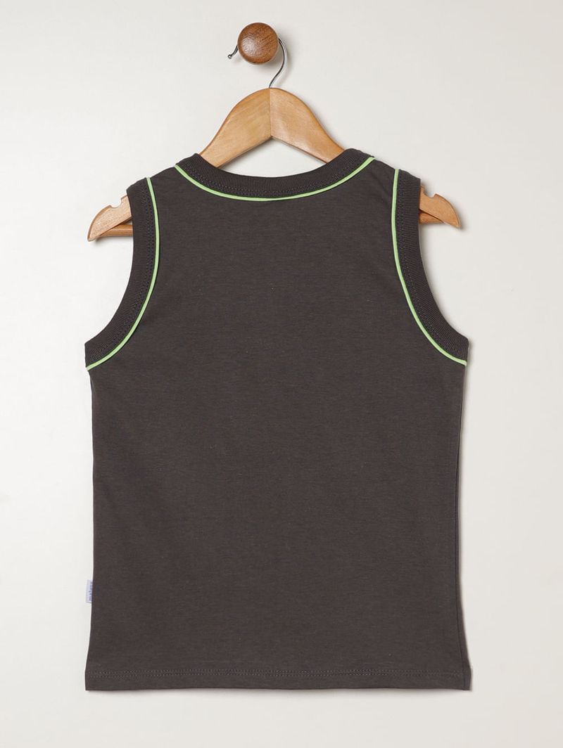 Regata infantil para menino confeccionada em meia malha 100% algodão, garantindo maciez, leveza e respirabilidade para acompanhar o ritmo ativo dos pequenos. O modelo possui gola redonda, mangas cavadas e barra com acabamento simples, entregando conforto e liberdade de movimentos em todas as brincadeiras. O diferencial fica por conta dos detalhes em tom contrastante e da estampa em silk na parte frontal, que adicionam um toque moderno e divertido ao visual. Uma peça prática, fresquinha e perfeita para o dia a dia!\n\nTecido: meia malha\nComposição: 100% algodão