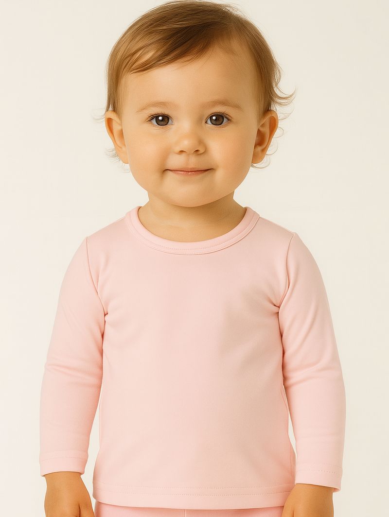 Camiseta térmica infantil para bebê desenvolvida em malha com parte interna flanelada que garante o conforto térmico que seu bebê precisa nos dias frios. Possui gola redonda, mangas compridas e barra com acabamento simples. A peça perfeita para manter os pequenos aquecidos e confortáveis!\n\nTecido: Malha\nComposição: 96% poliéster, 04% elastano