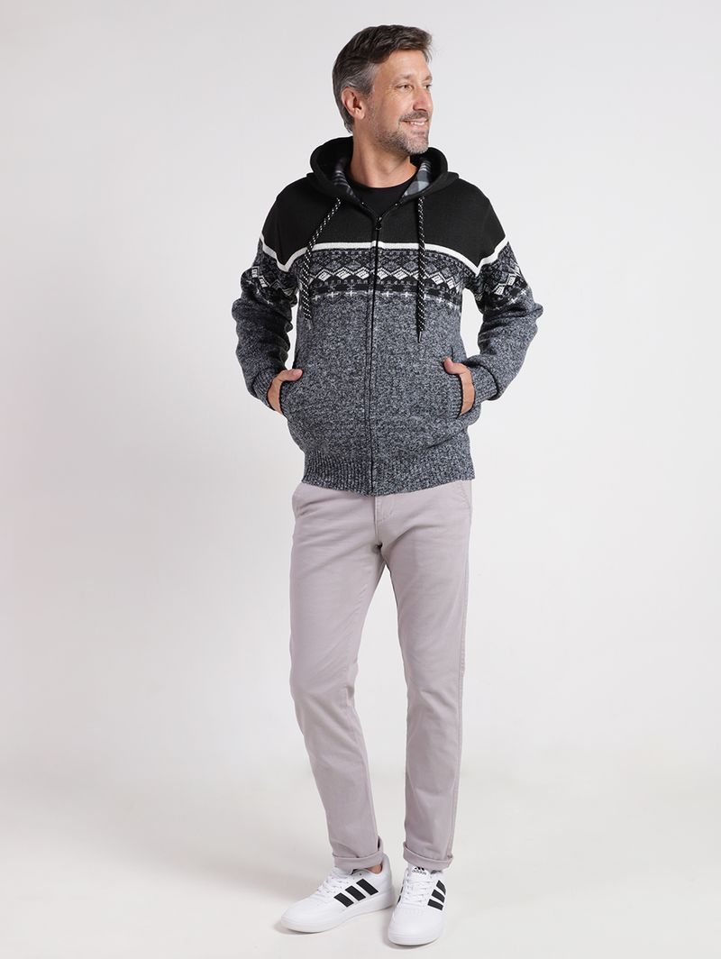 Cardigan masculino desenvolvido em tricot dublado com parte interna em soft, garantindo ainda mais conforto e aquecimento para os dias frios. O modelo apresenta capuz com ajuste por cordão, mangas longas com punho, fechamento frontal por zíper e acabamentos em pontos canelados. Possui bolsos funcionais. Como diferencial, a peça conta com estampa que traz um toque de personalidade e autenticidade ao seu visual. O cardigan perfeito para quem busca um look casual, mas com um diferencial marcante!\n\nMaterial: Tricot Dublado\nTecido parte interna: Soft\nComposição: 100% poliéster