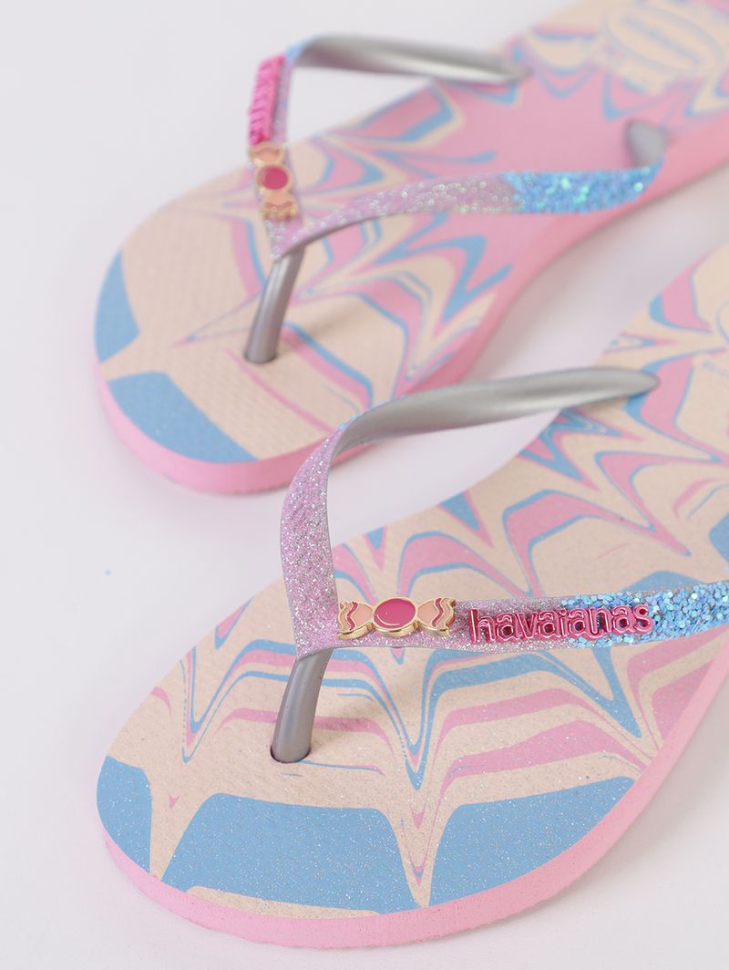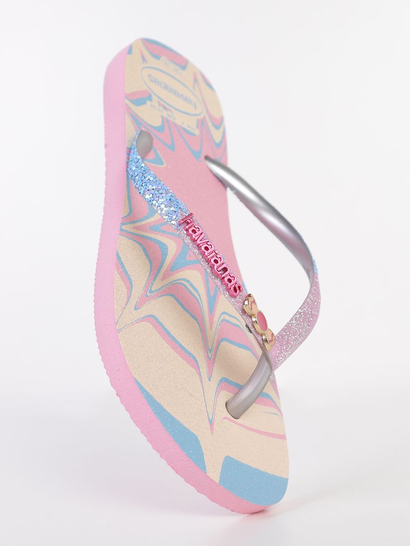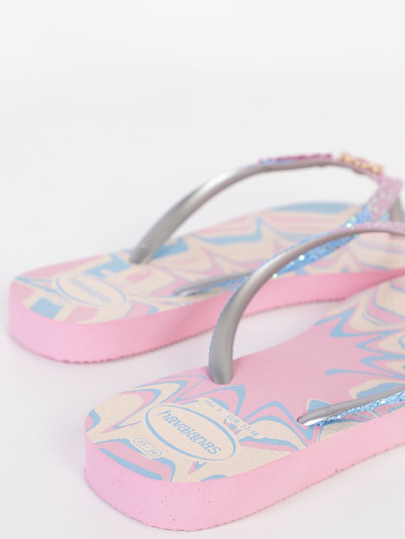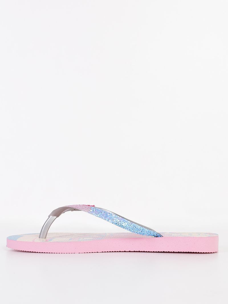 Chinelo infantil para menina desenvolvido em material emborrachado, resistente, flexível e confortável para os pés. Além disso, é altamente durável, suportando o uso constante sem perder a forma. O modelo slim se caracteriza por possuir um design moderno com tiras mais finas. Apresenta divisor de dedos, palmilha macia texturizada e solado com frisos antiderrapantes. Como diferencial, possui estampa inspirada em um mundo fantástico repleta de glitter holográfico, já suas tiras ganham ainda mais brilho e um charmoso acessório central. Transforme o dia a dia das crianças em uma verdadeira diversão com esse chinelo infantil!\n\nMaterial: Borracha