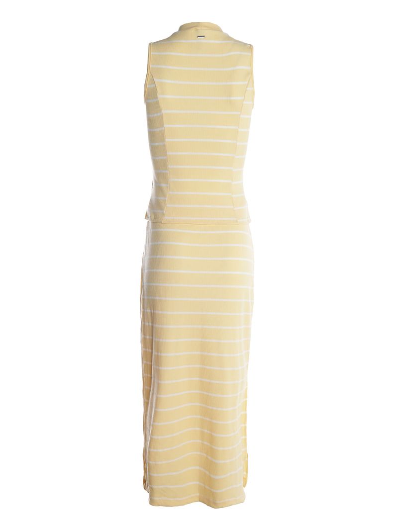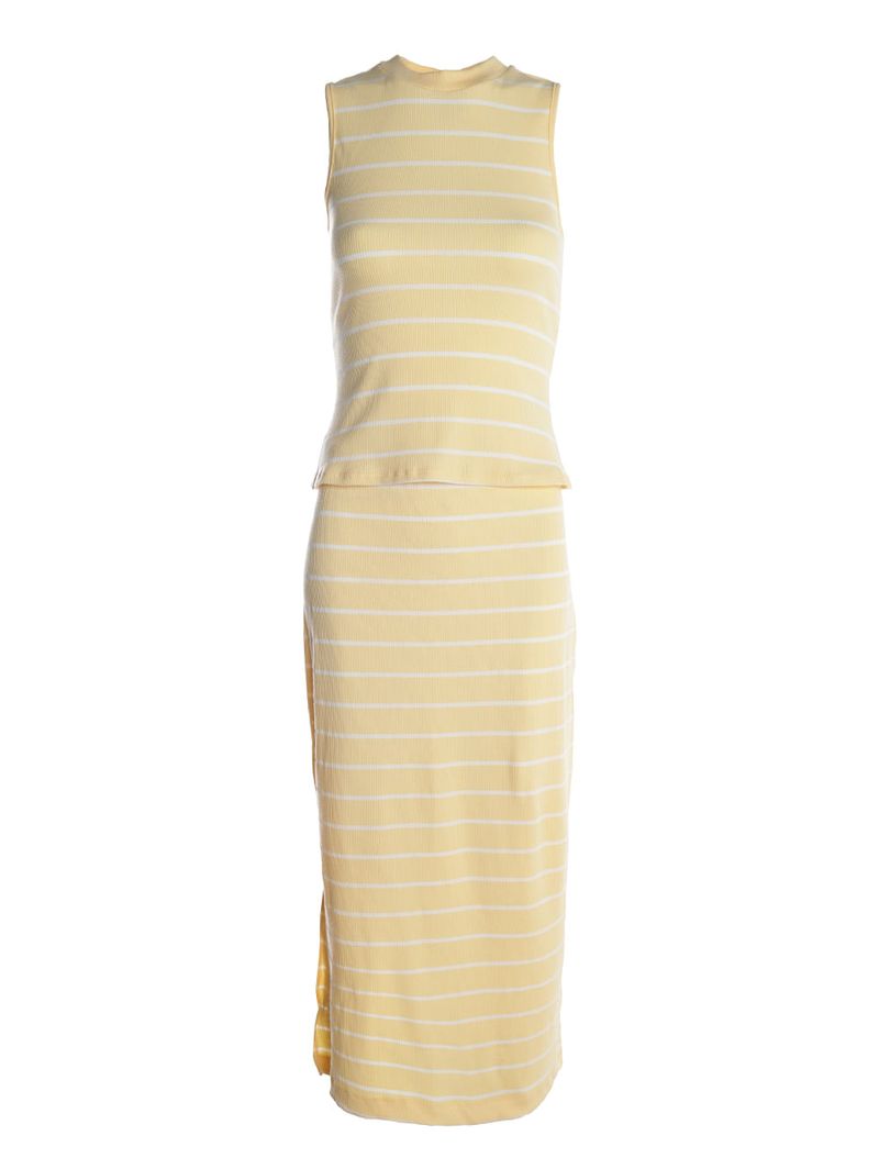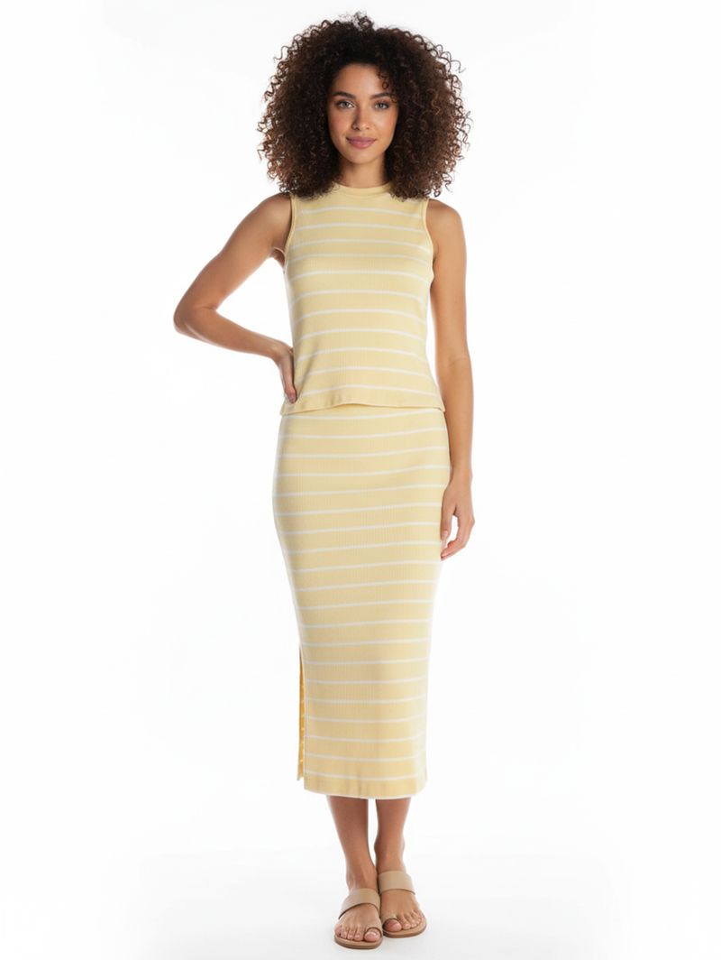 Conjunto feminino desenvolvido em malha canelada, proporcionando toque macio, ótima elasticidade e caimento confortável para o dia a dia. A blusa regata apresenta gola média, mangas cavadas e acabamentos simples que garantem praticidade e um visual moderno. A saia conta com cós elástico, comprimento midi e fenda lateral que adiciona charme e movimento à peça. A padronagem listrada valoriza o conjunto com um toque atual e elegante, perfeito para compor looks casuais cheios de estilo!\n\nTecido: Malha Canelada\nComposição: 79% algodão, 14% poliéster, 07% elastano