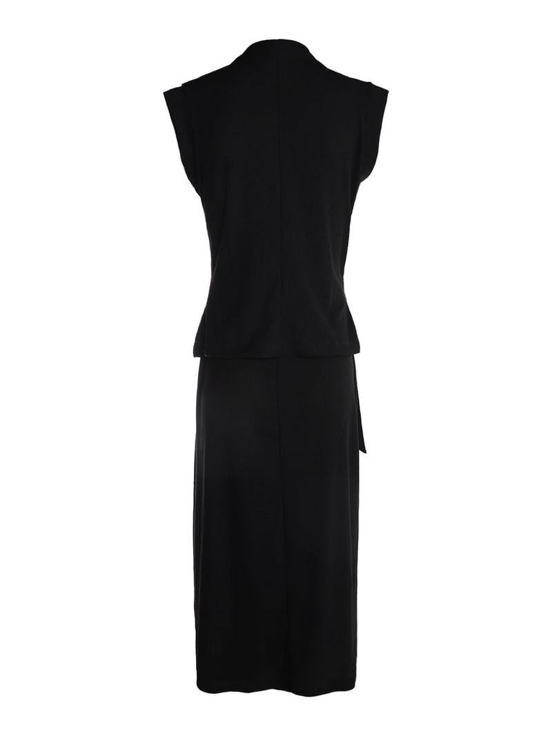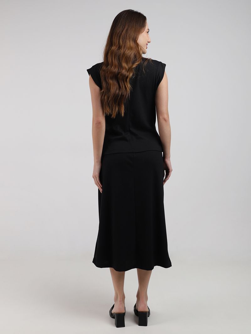 Conjunto feminino composto por duas peças, sendo uma blusa e uma saia, ambas confeccionadas em malha texturizada, um tecido macio e com caimento confortável. A blusa apresenta gola média, mangas cavadas, acabamentos simples e detalhe de tira com ajuste por aviamento orgânico. A saia possui comprimento midi, cós elástico e acabamentos simples. O conjunto perfeito para quem ama um visual marcante e cheio de estilo!\n\n Tecido: Malha Texturizada\n Composição: 98% poliéster, 02% elastano